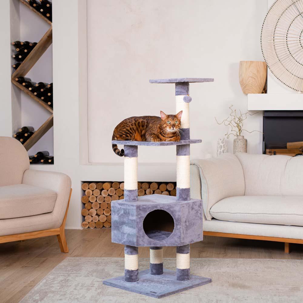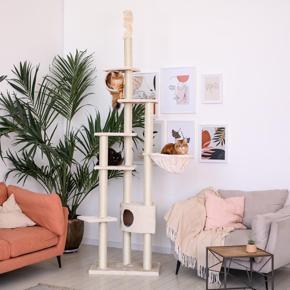 – игровые комплексы, оснащенные гамаками, гнездами, домиками-цилиндрами, несколькими столбиками разной высоты — это отличный вариант для хозяев сразу нескольких котиков или одного очень активного питомца.