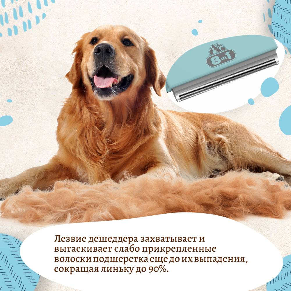 - Благодаря дешеддеру 8in1, вы забудете о выпавшей шерсти в доме, а ваш питомец будет выглядеть ухоженно.