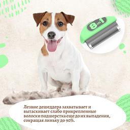 - Лезвие дешеддера захватывает и вытаскивает слабо прикрепленные волоски подшерстка еще до их выпадения, сокращая линьку собаки до 90%.
