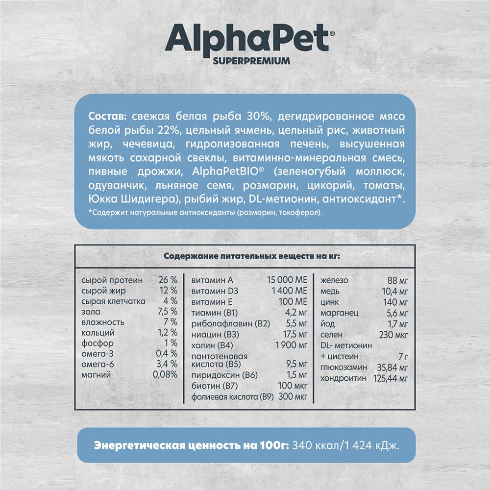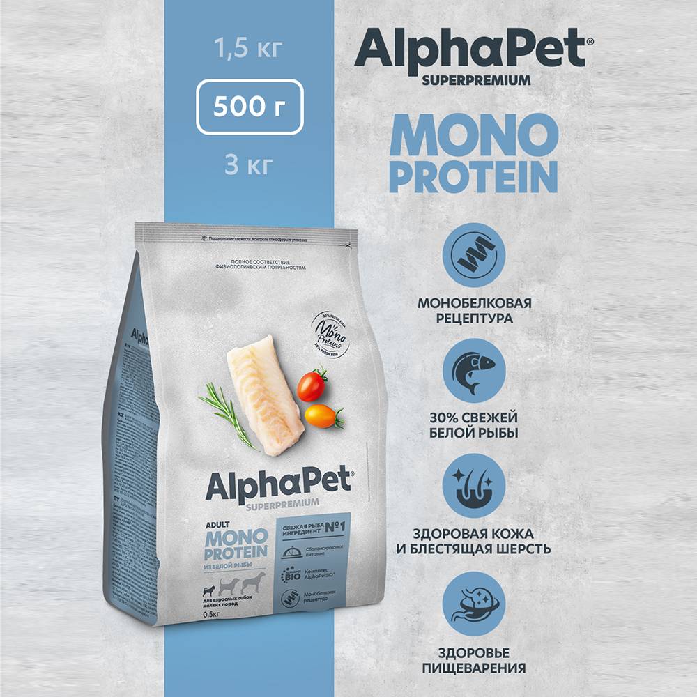 Здоровый и активный питомец – главная задача каждого хозяина. Команда AlphaPet® создает и производит полезные корма высшей категории качества Holistiс, давая возможность каждому владельцу быть уверенным в правильном выборе кормления для своего животного. AlphaPet® MONOPROTEIN на основе белой рыбы - благодаря единственному источнику животного белка, подойдет животным с пищевой непереносимостью.