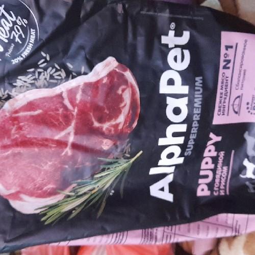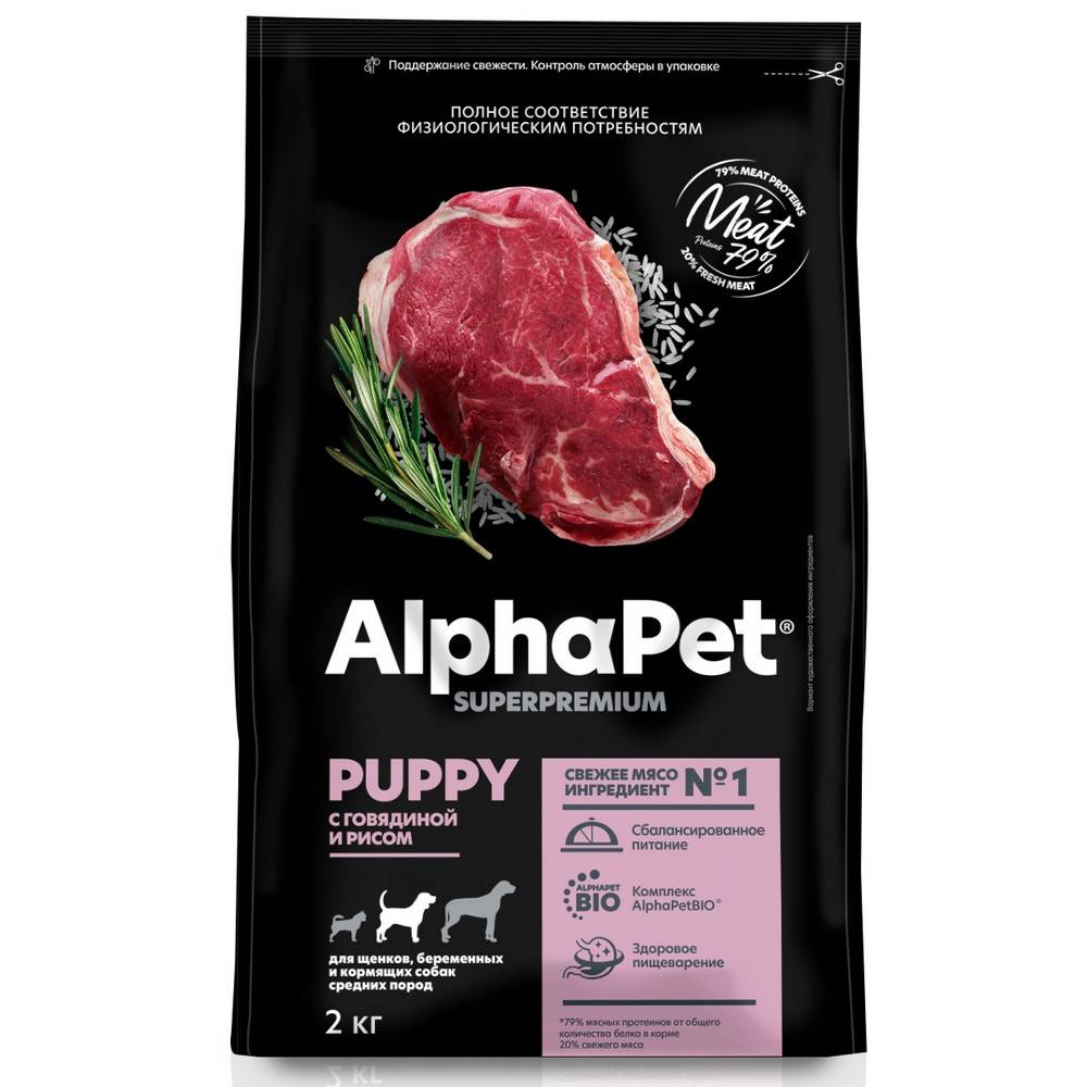 Сухой полнорационный корм с говядиной и рисом для щенков, беременных и кормящих собак средних пород AlphaPet Superpremium.