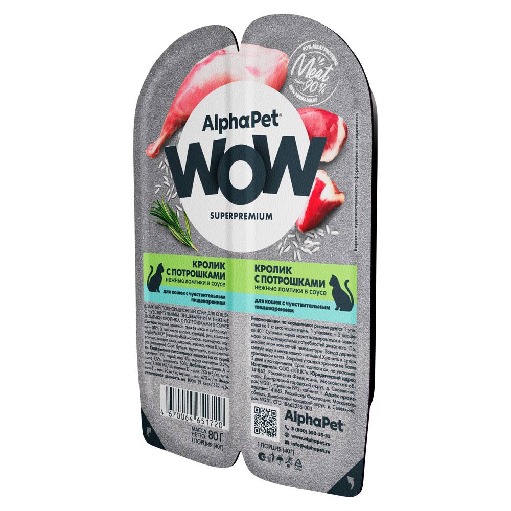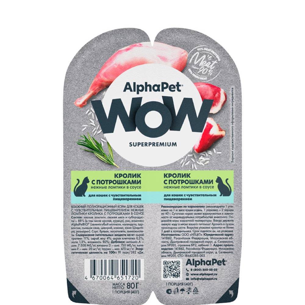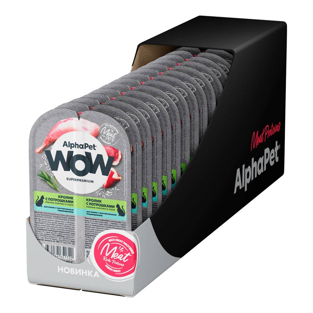 Здоровый и активный питомец – главная задача каждого хозяина. Команда AlphaPet® создает и производит полезные корма высшей категории качества Holistiс, давая возможность каждому владельцу быть уверенным в правильном выборе кормления для своего животного. AlphaPet® WOW - линейка качественного питания по доступной цене для животных, владельцы которых хотят быть уверены в выборе лучшего качества рациона по разумной цене. Максимально открытый и понятный состав кормов, приготовленных по инновационной технологии из свежего мяса и с содержанием более чем 90% мясного белка!