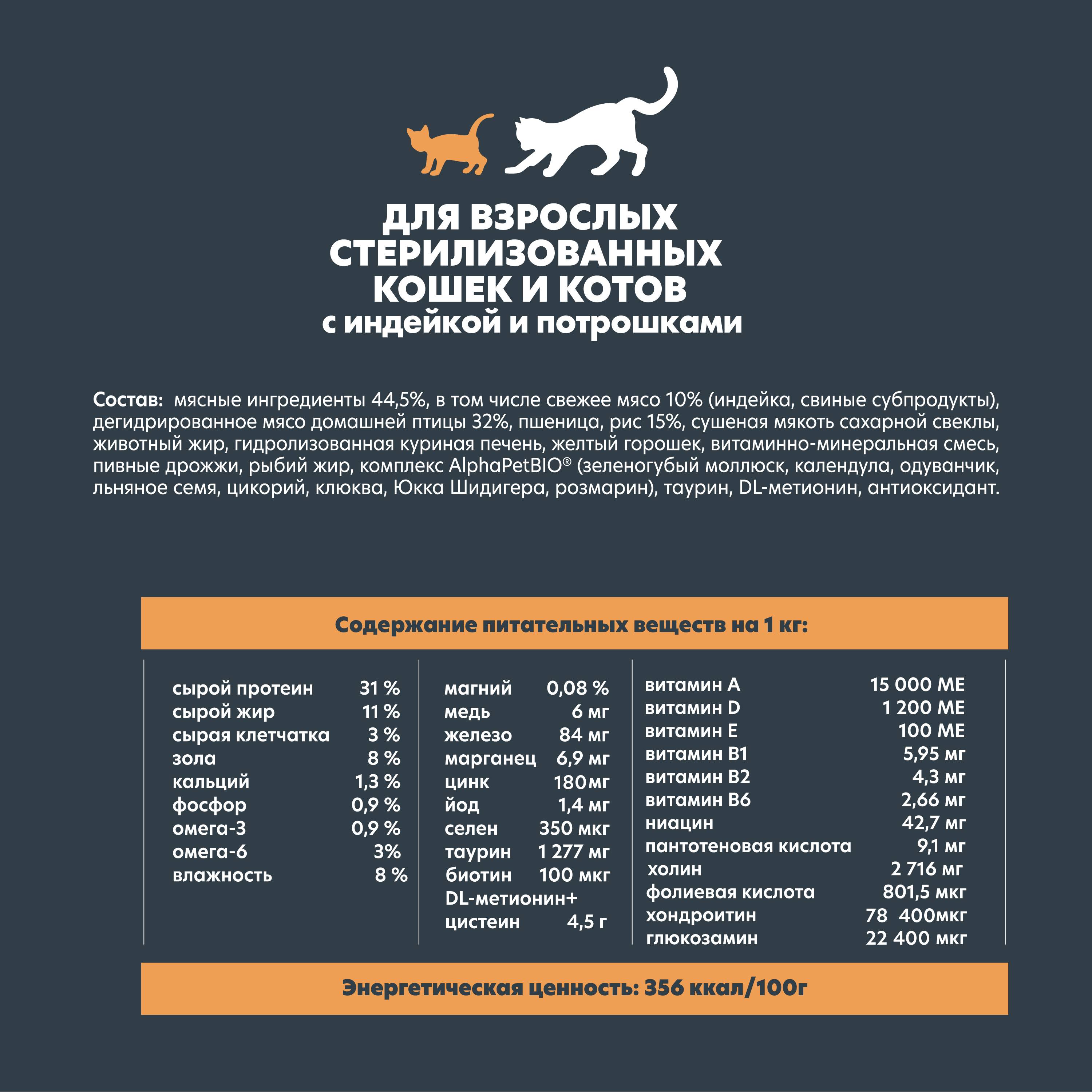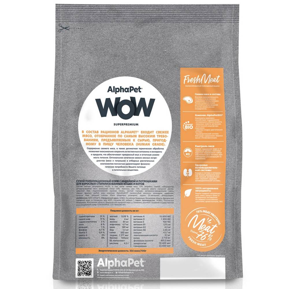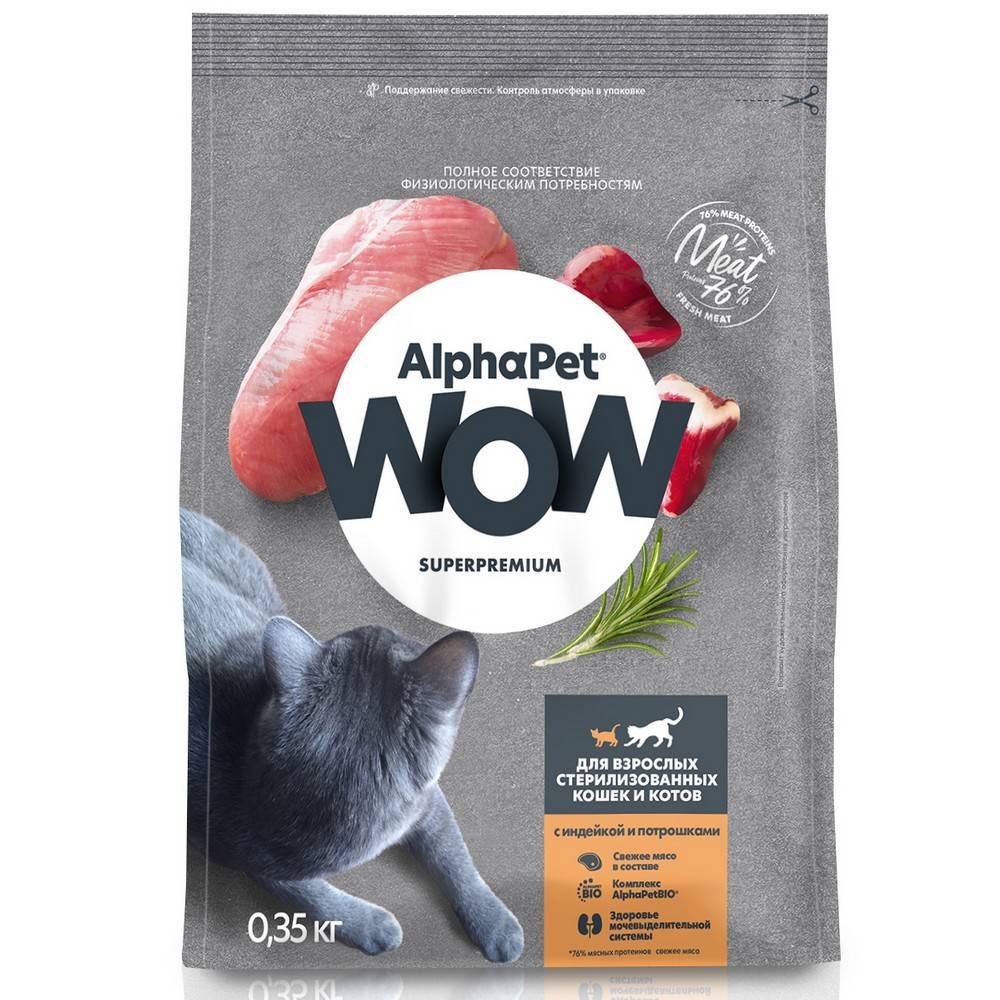Сухой полнорационный корм с индейкой и потрошками для взрослых стерилизованных кошек и котов AlphaPet WOW Superpremium.