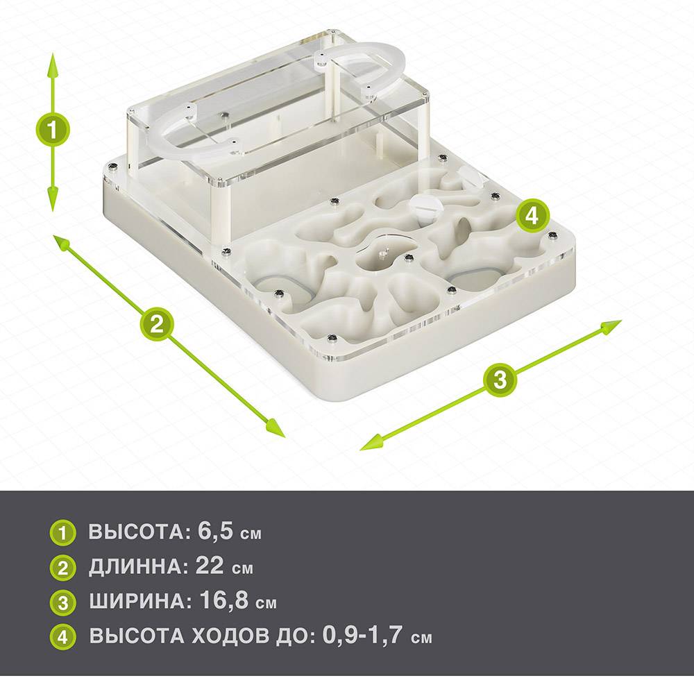 Высота: 6,5 см. Ширина: 16,8 см. Длина: 22 см. Высота жилого пространства ходов: от 0,9 до 1,7 см.Преимущества: