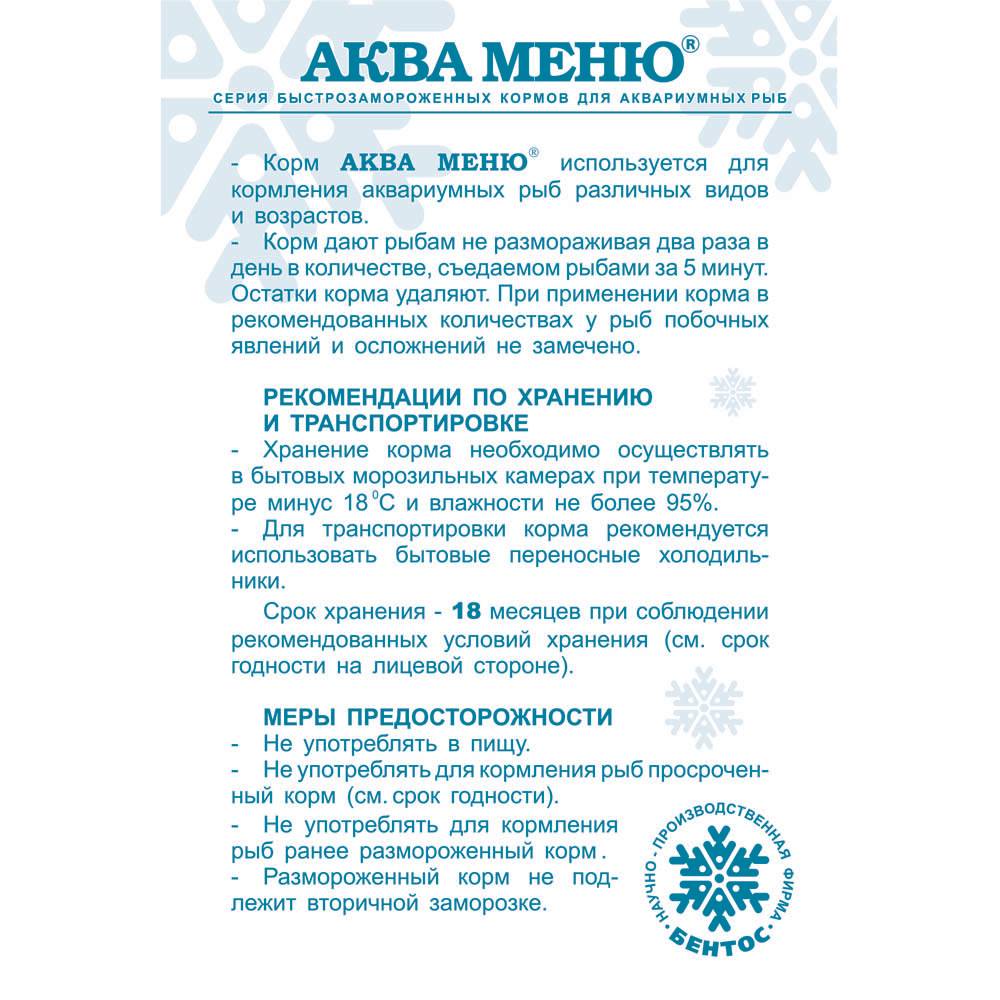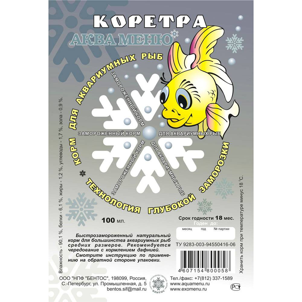 КОРЕТРА — быстрозамороженный натуральный корм для большинства аквариумных рыб средних размеров. Рекомендуется чередование с кормлением дафнией.