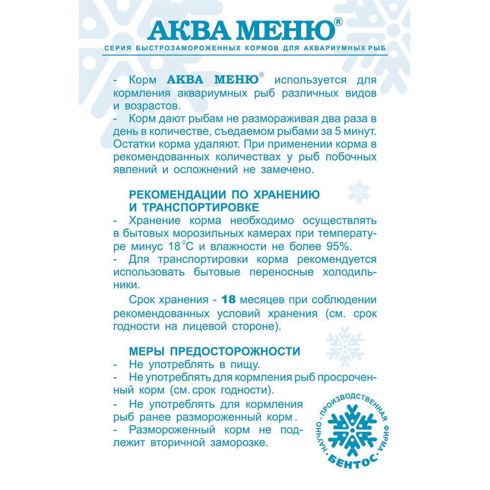 Корм дают рыбам не размораживая 2 раза в день в количестве, съедаемом рыбами за 5 минут. Остатки корма удаляют. При применении корма в рекомендованных количествах у рыб побочных явлений и осложнений не замечено.