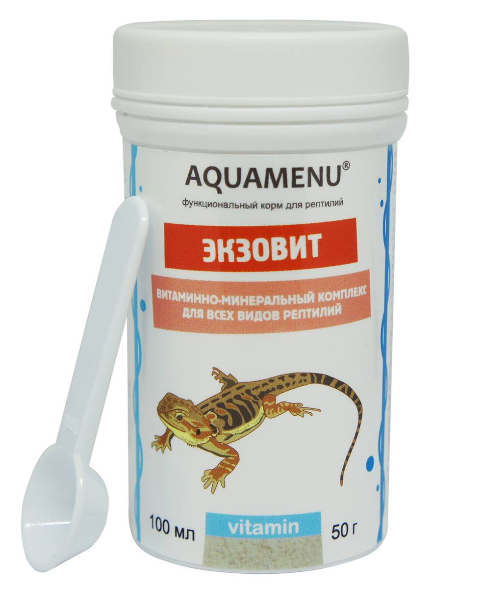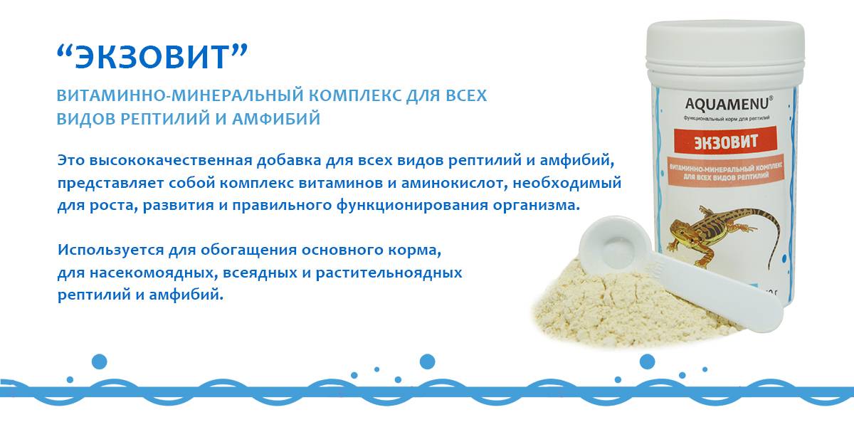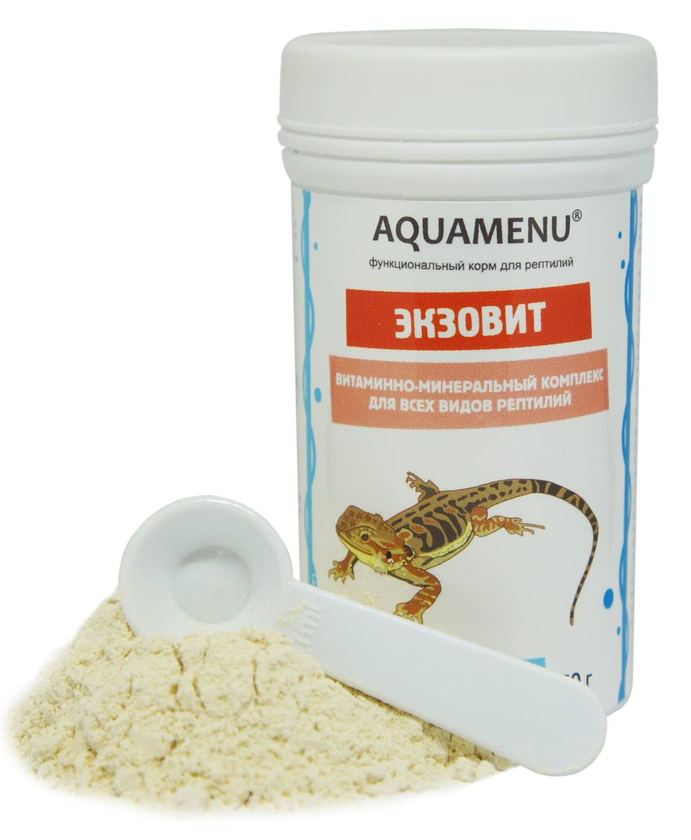 ЭКЗОВИТ - высококачественная добавка для всех видов рептилий и амфибий, представляет собой комплекс витаминов и аминокислот, необходимый для роста, развития и правильного функционирования организма. Используется для обогащения основного корма, для насекомоядных, всеядных и растительноядных рептилий и амфибий.