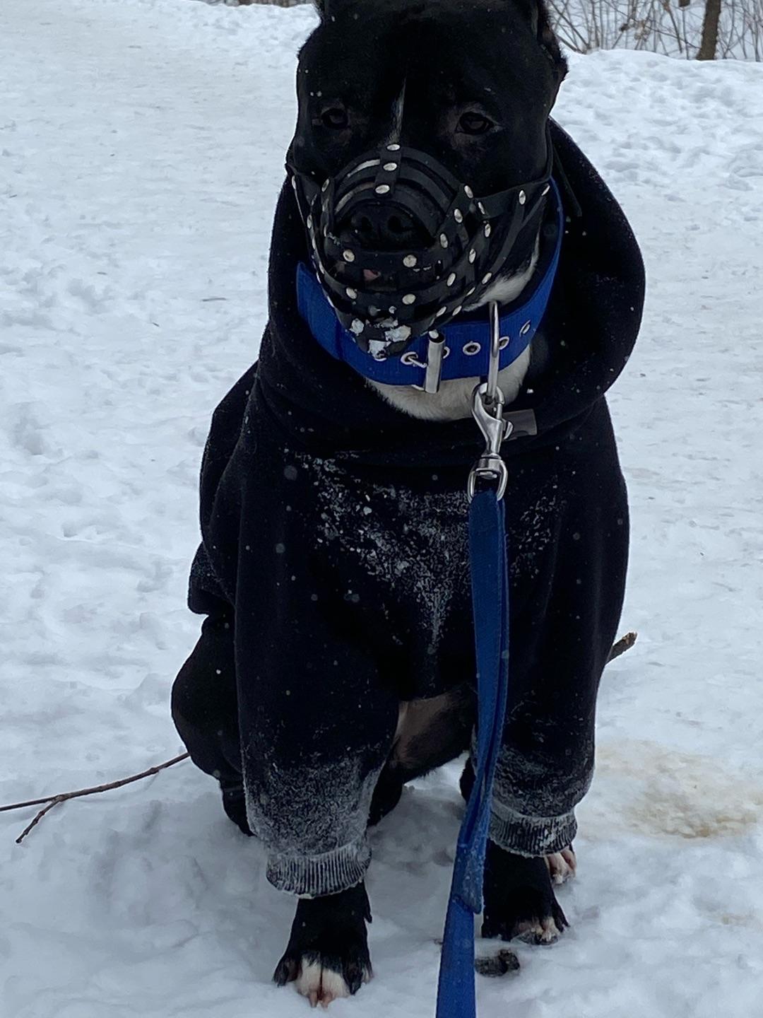 Собака американскмй булли, на морде сидит хорошо, снять не удается, на прогулке не мешаетИрина Теодоровна Л.