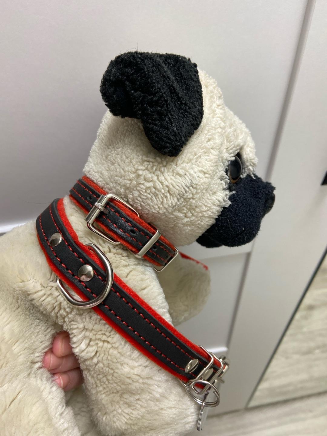 Верхний слой аксессуара выполнен из натуральной кожи черного цвета, а нижний слой из мягкого фетра голубого оттенка. Поводок крепится к надежному пристяжному кольцу из металла. Ширина шлейки составляет 20 мм, а регулирующая длина – от 24 до 37 см. Аккуратная декоративная строчка подчеркнет индивидуальность воспитанника. Металлический замок на шлейке регулируется по окружности шеи животного.