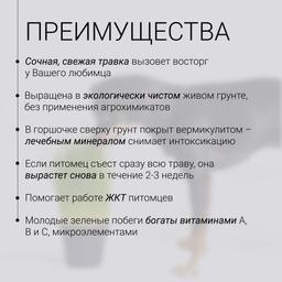Натуральное и полезное лакомство, травка для кошек, собак, домашних грызунов и птиц. Может использоваться как декоративная травка для украшения дома.