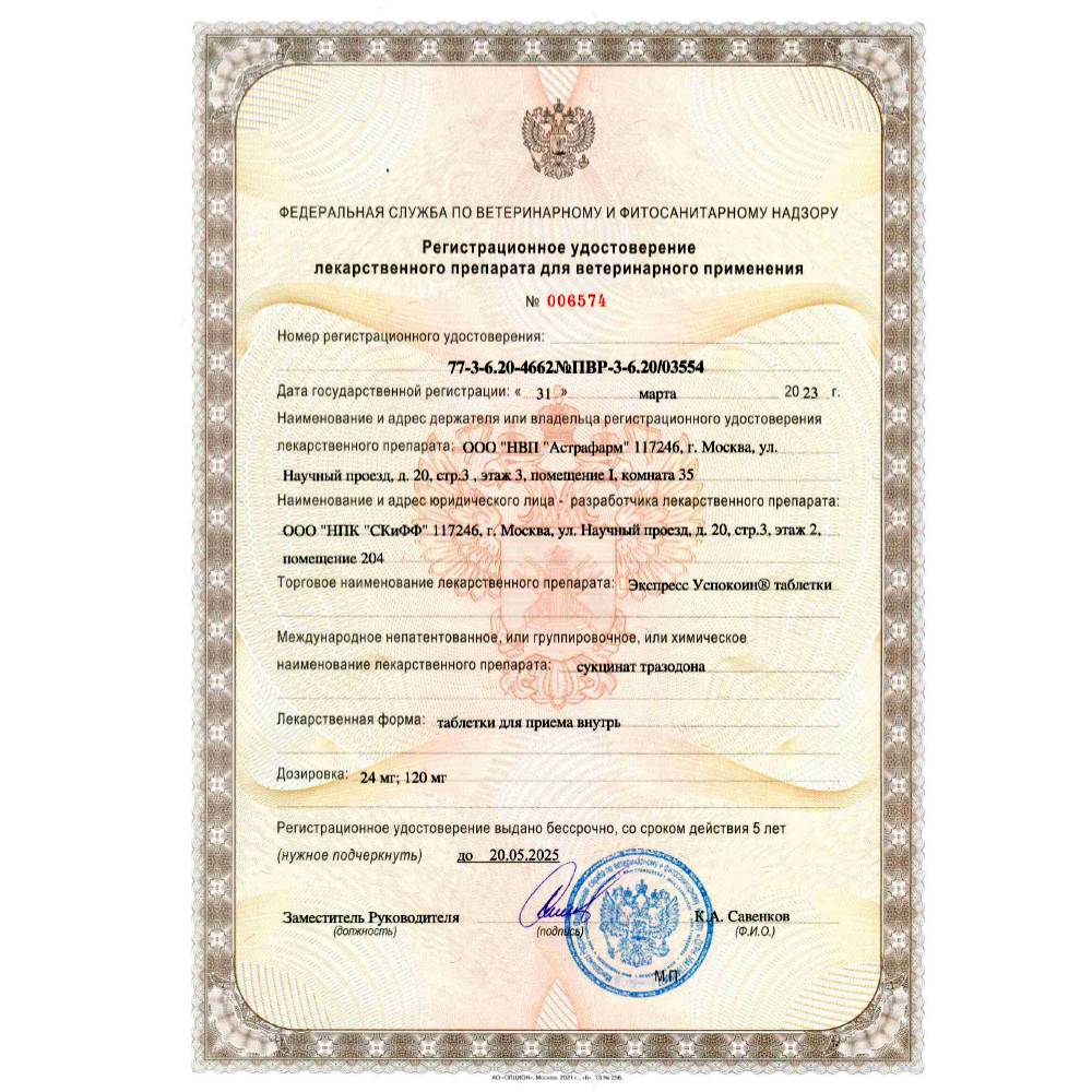 Применение препарата Экспресс Успокоин таблетки позволяет решать большинство ситуационных проблем, связанных с поведением, благодаря действующему веществу, входящему в состав препарата - сукцинату тразодона, который является запатентованной разработкой производителя.