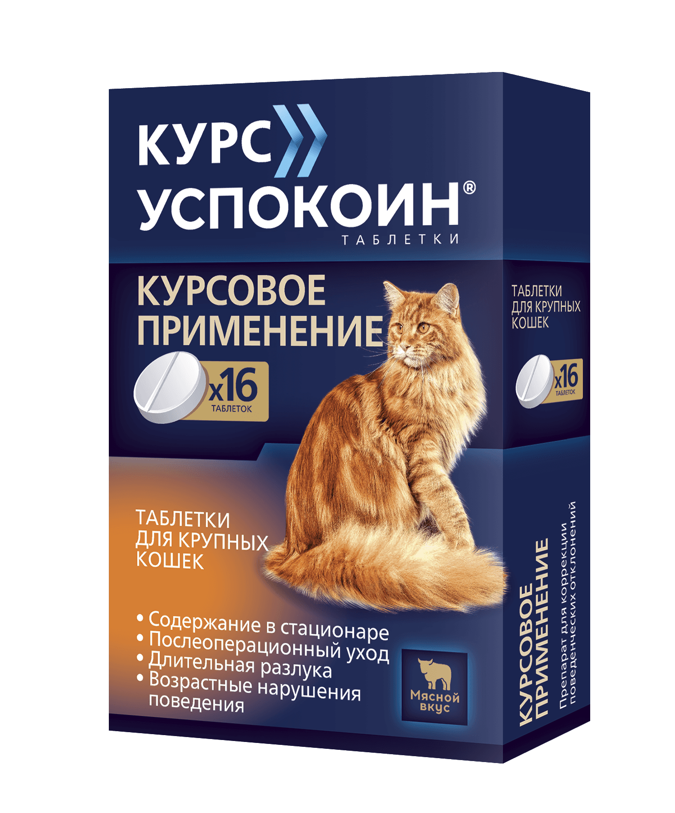 Курс Успокоин выпускается в таблетках, которые имеют оболочку с мясным вкусом, что улучшает поедаемость препарата. Давать препарат Курс Успокоин рекомендуется не позднее чем за 30 минут до основного кормления либо через 2-4 часа после основного кормления.