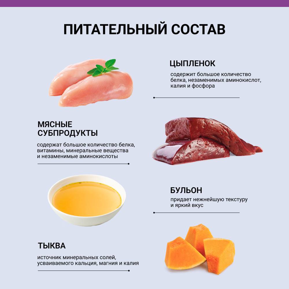 - Текстура корма отличается мягкостью, благодаря введению в состав наваристого бульона, что придает консервам насыщенный вкус и аппетитный аромат.