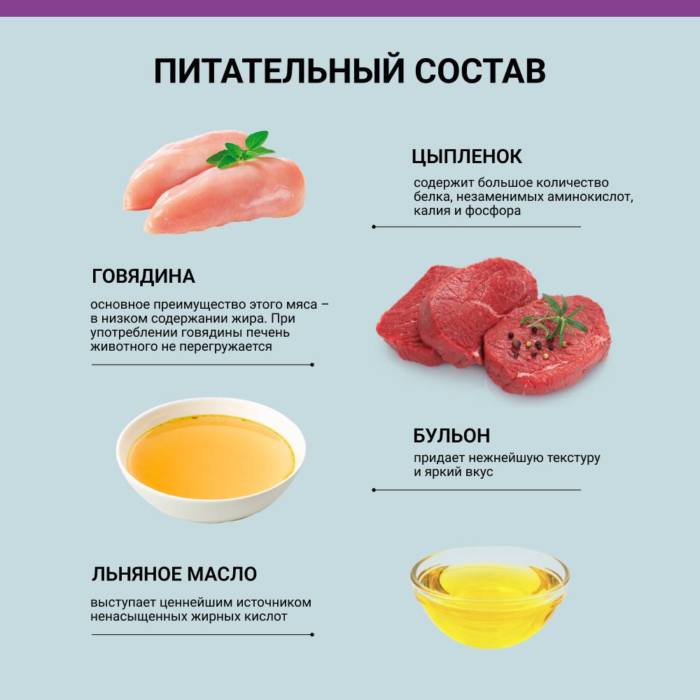 - Текстура корма отличается мягкостью, благодаря введению в состав наваристого бульона, что придает консервам насыщенный вкус и аппетитный аромат.