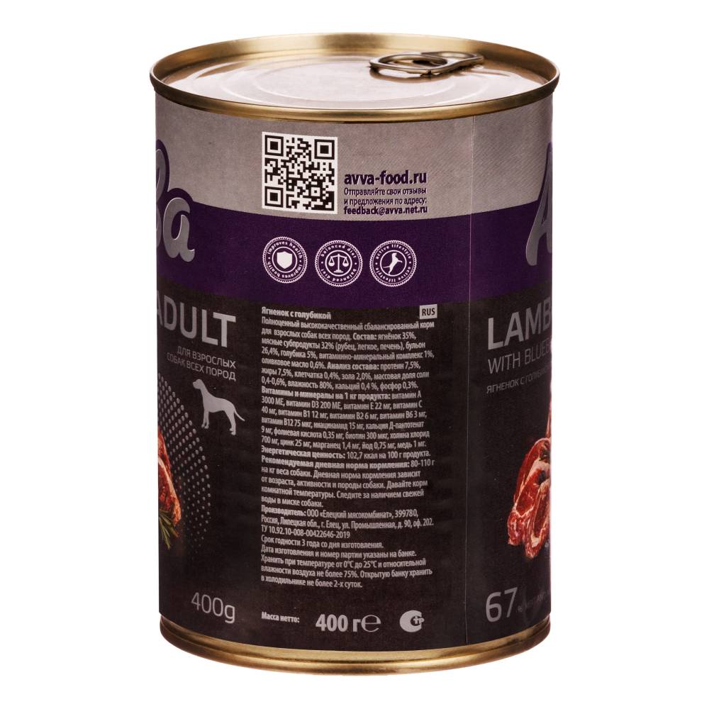 Корм для собак Авва Premium консервы для собак с ягненком и голубикой является полнорационным питанием для вашего питомца на каждый день.