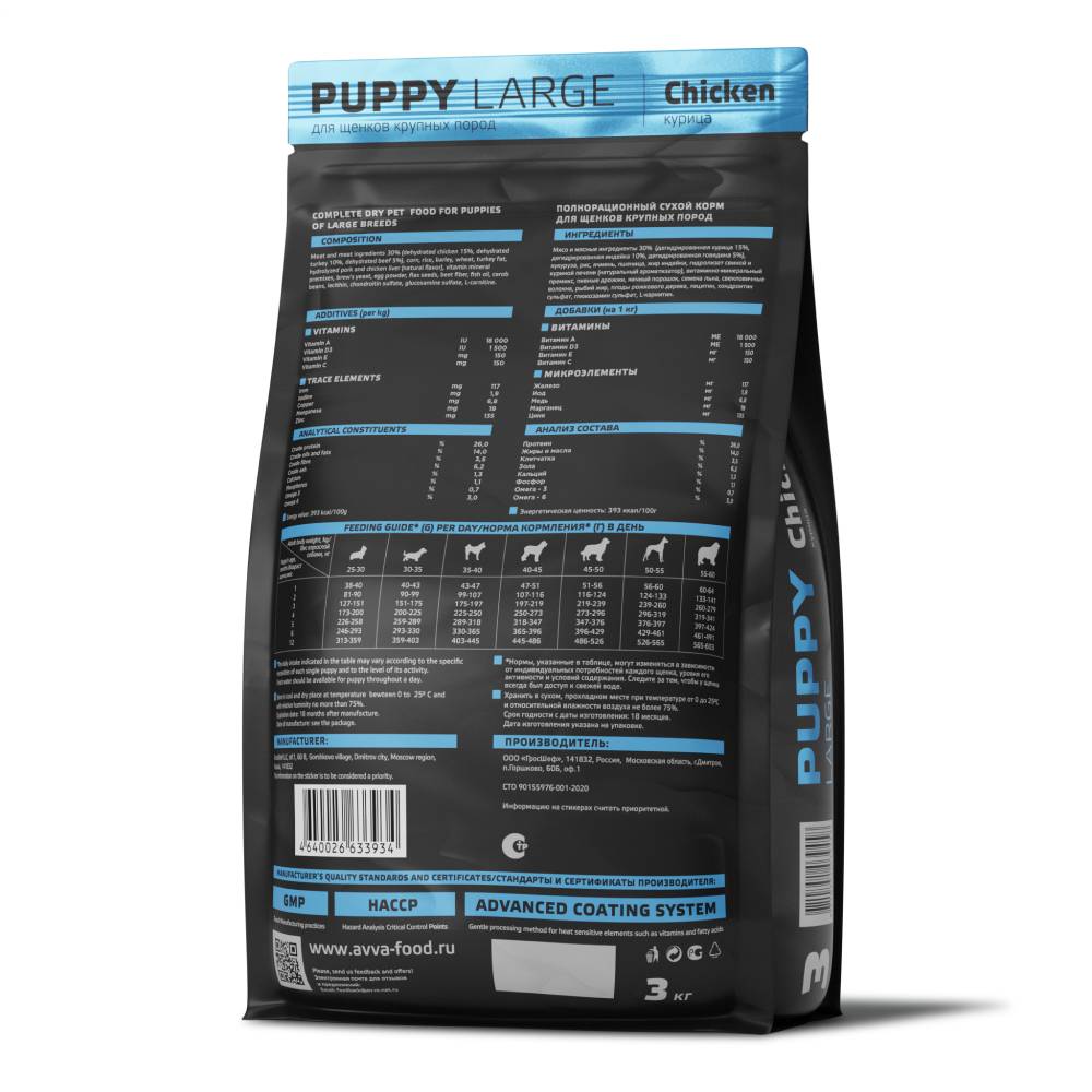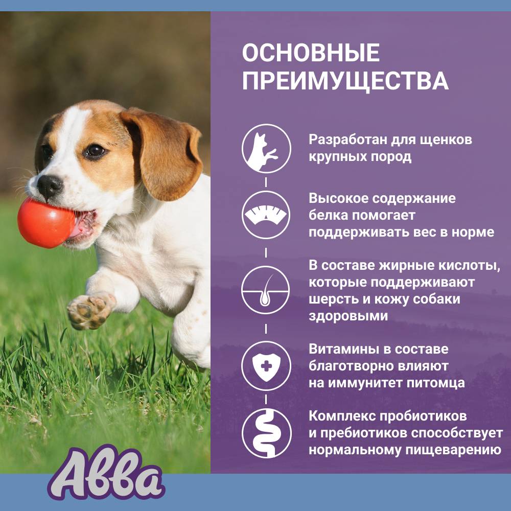 АВВА Premium Puppy Large Курица - полнорационный, сбалансированный корм для щенков крупных пород. Содержит все необходимые витамины, минералы для здорового роста и развития щенка в самый важный период его жизни.