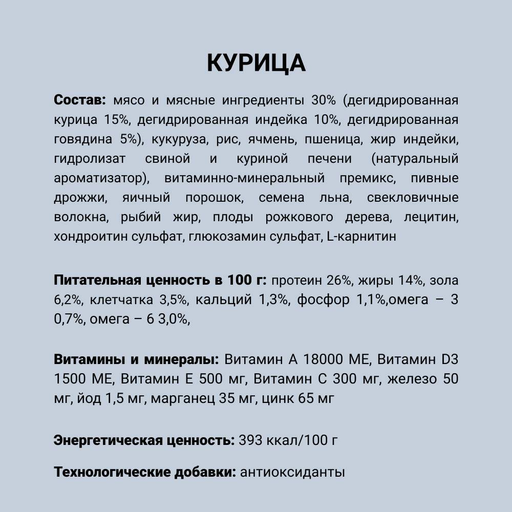- Здоровье кожи и шерсти питомца обеспечивается благодаря содержанию в составе корма полезных жирных кислот Омега-3 и Омега-6.