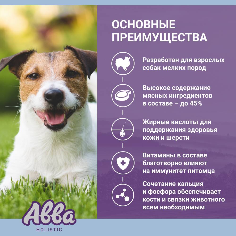 АВВА Holistic – это полнорационный корм для взрослых собак мелких пород, изготовлен на основе свежего мяса (20%). Корм сбалансирован по количеству жиров и протеинов, учитывает особенности развития собак мелких пород, предупреждая набор лишнего веса. Приготовлен без использования злаков, что снижает вероятность возникновения аллергических реакций. Небольшой размер гранул позволяет с лёгкостью наслаждаться приёмом пищи.