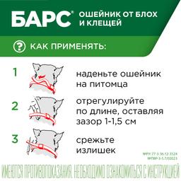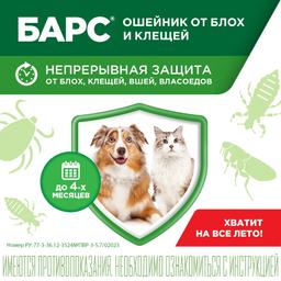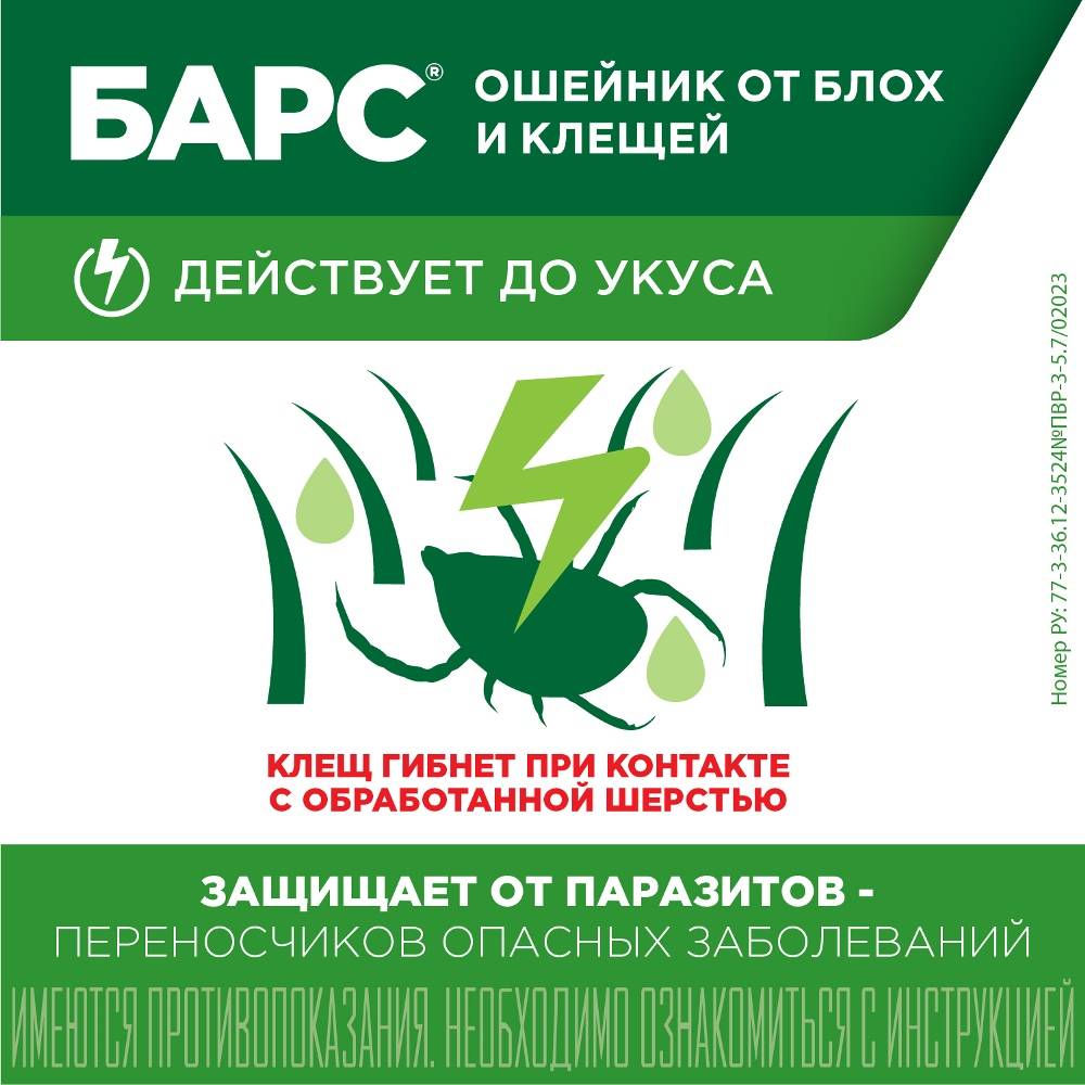 Непрерывное использование инсектоакарицидного ошейника «Барс» обеспечивает защиту собак и кошек от блох, вшей, власоедов, иксодовых клещей до 4-х месяцев. В первые дни применения ошейника возможно нападение и прикрепление иксодовых клещей на животное, но через 1 день паразиты погибают и засыхают или самопроизвольно отпадают.