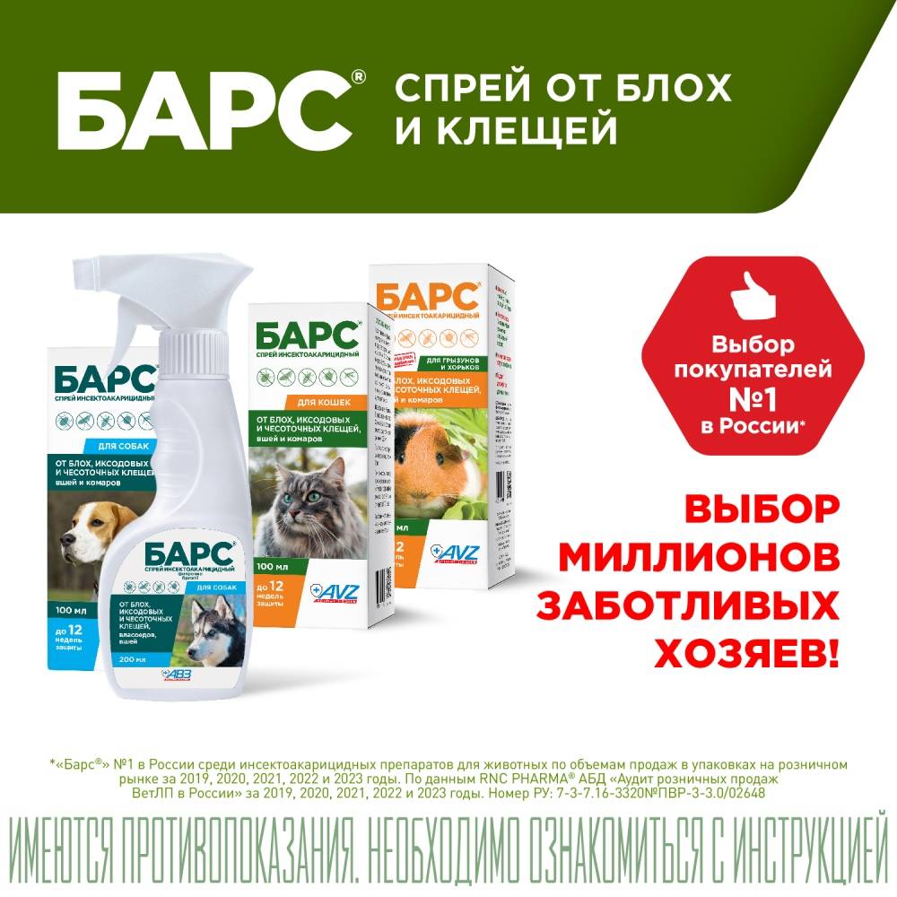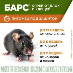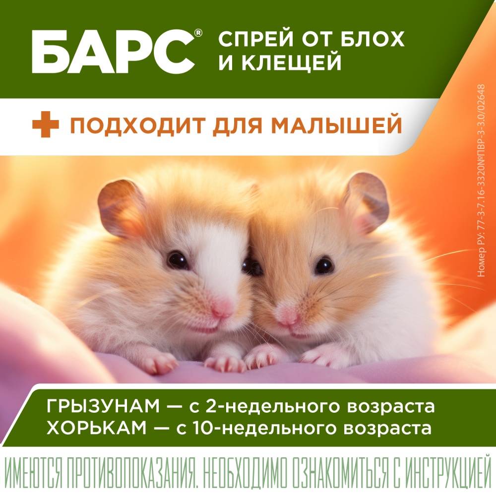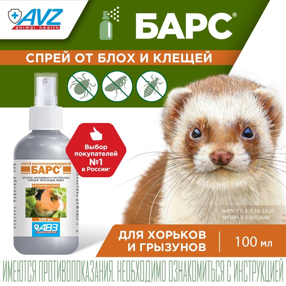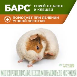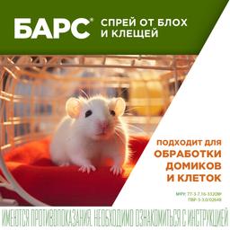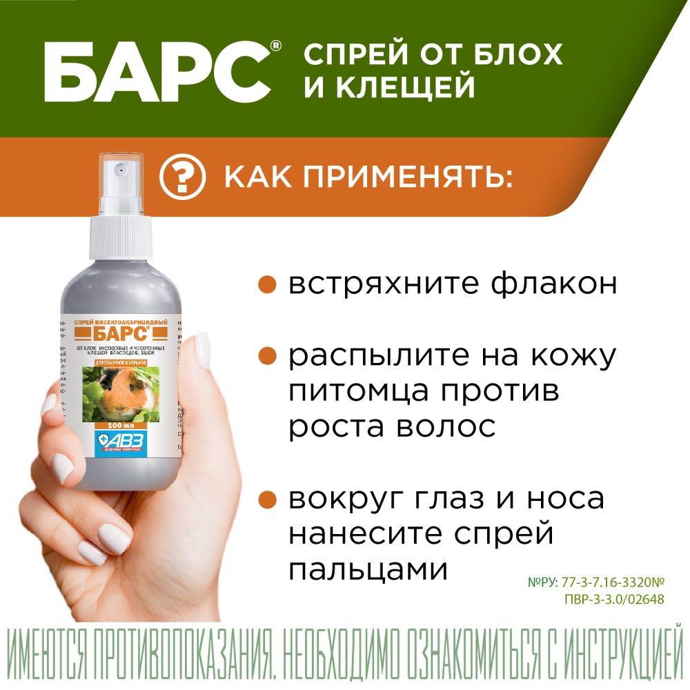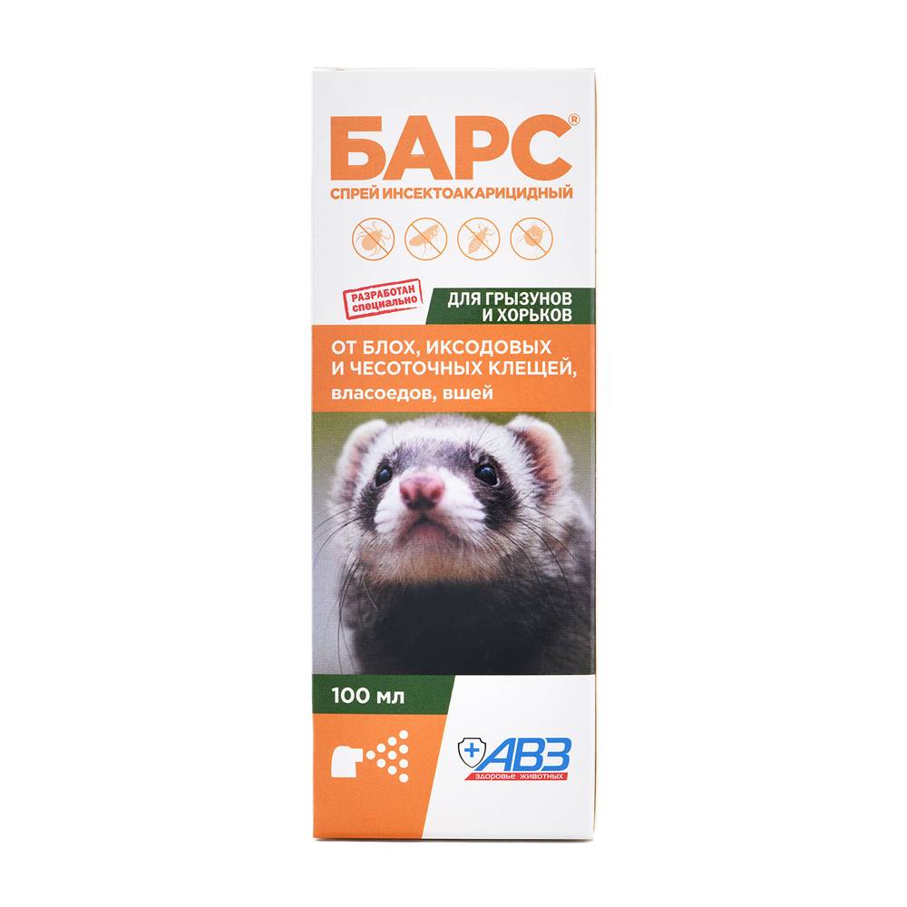 БАРС® спрей инсектоакарицидный применяют для защиты хорьков, шиншилл, морских свинок, крыс и хомяков от эктопаразитов, а также для лечения и профилактики заболеваний, вызываемых блохами (афаниптероз), вшами (линогнатоз, триходектоз), чесоточными (саркоптоз, нотоэдроз, отодектоз) и тромбидиформными (демодекоз, хейлетиеллез) клещами, при поражении иксодовыми клещами, в комплексной терапии демодекоза и аллергического дерматита, вызываемого укусами блох, а также в целях защиты животных от нападения двукрылых кровососущих насекомых.