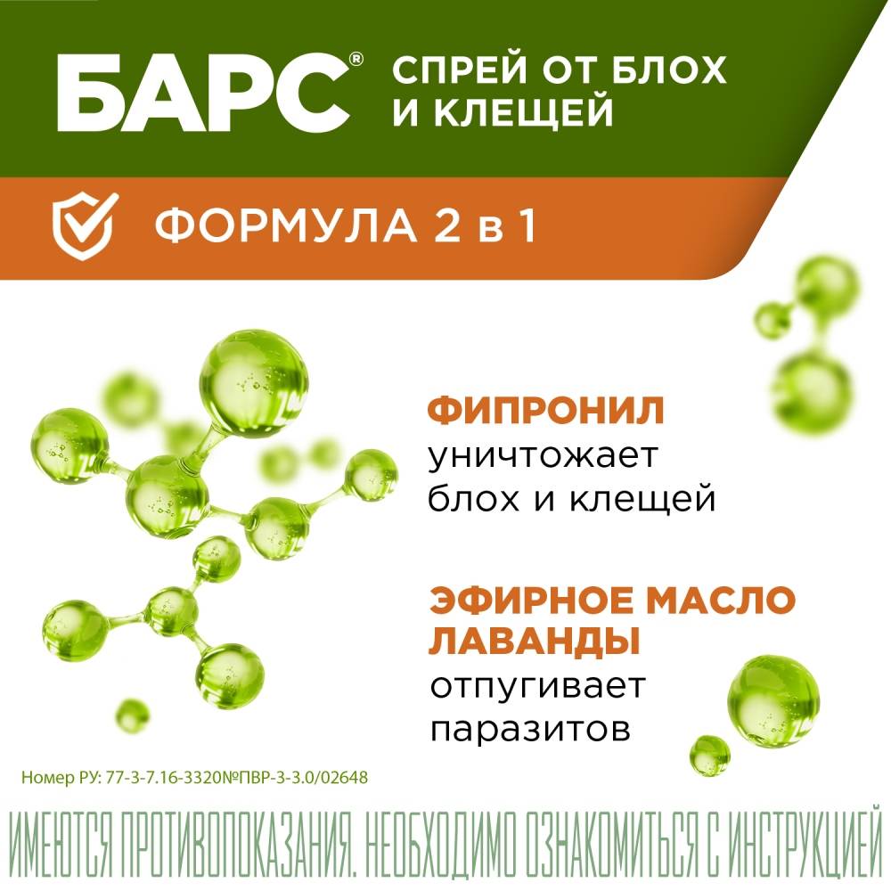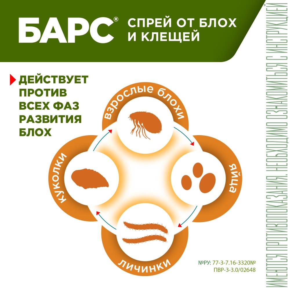 Для предотвращения повторной инфестации эктопаразитами рекомендуется обрабатывать препаратом БАРС® спрей инсектоакарицидный всех животных, обитающих совместно, осуществить замену или обработку подстилок, домиков и других предметов ухода за животными, а также полов в помещении из расчета 2 мл препарата на 1 м2 обрабатываемой поверхности. В течение трех дней не допускают контакта животного с обработанными предметами, а перед последующим использованием их стирают (моют) с моющими средствами.