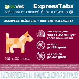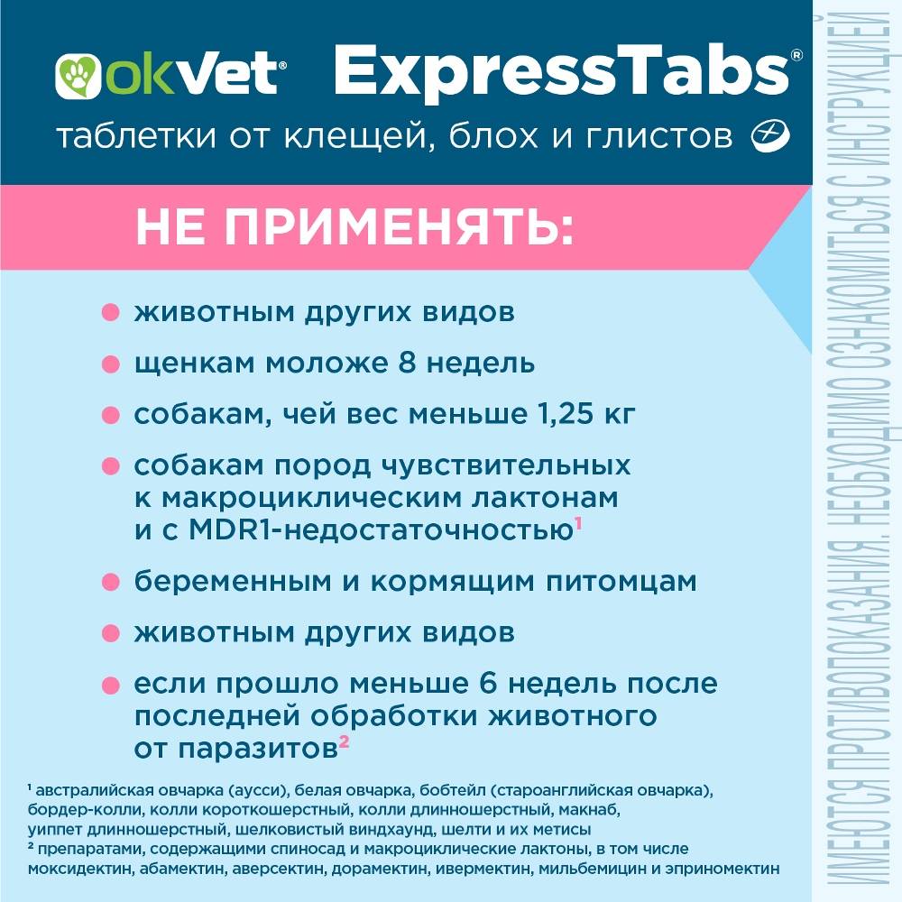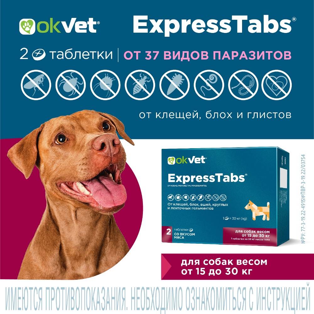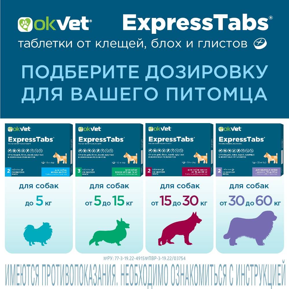 ЭкспрессТабс® назначают взрослым собакам и щенкам для лечения и профилактики ассоциативных паразитарных заболеваний, вызываемых блохами, иксодовыми клещами, вшами, чесоточными и тромбидиформными клещами, нематодами и цестодами, для профилактики дирофиляриоза, вызываемого личинками Dirofilaria immitis и Dirofilaria repens, а также снижения риска заражения трансмиссивными заболеваниями, переносчиками которых являются иксодовые клещи.Противопоказания