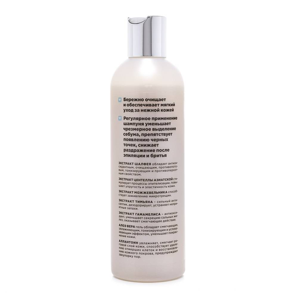 - Регулярное применение шампуня уменьшает чрезмерное выделение себума, препятствует появлению черных точек, снижает раздражение после эпиляции и бритья.