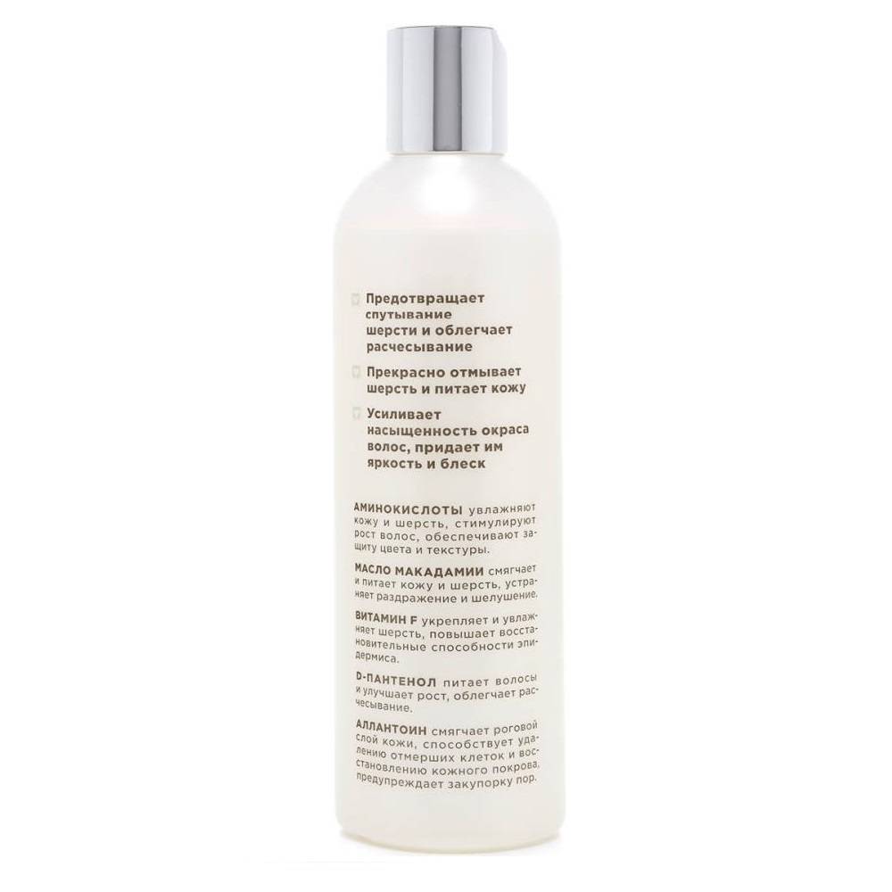 - Шампунь обладает выраженными моющими свойствами, легко смывается водой. Предотвращает спутывание шерсти и облегчает расчесывание. Прекрасно отмывает шерсть и питает кожу. Усиливает насыщенность окраса волос, придает им яркость и блеск.