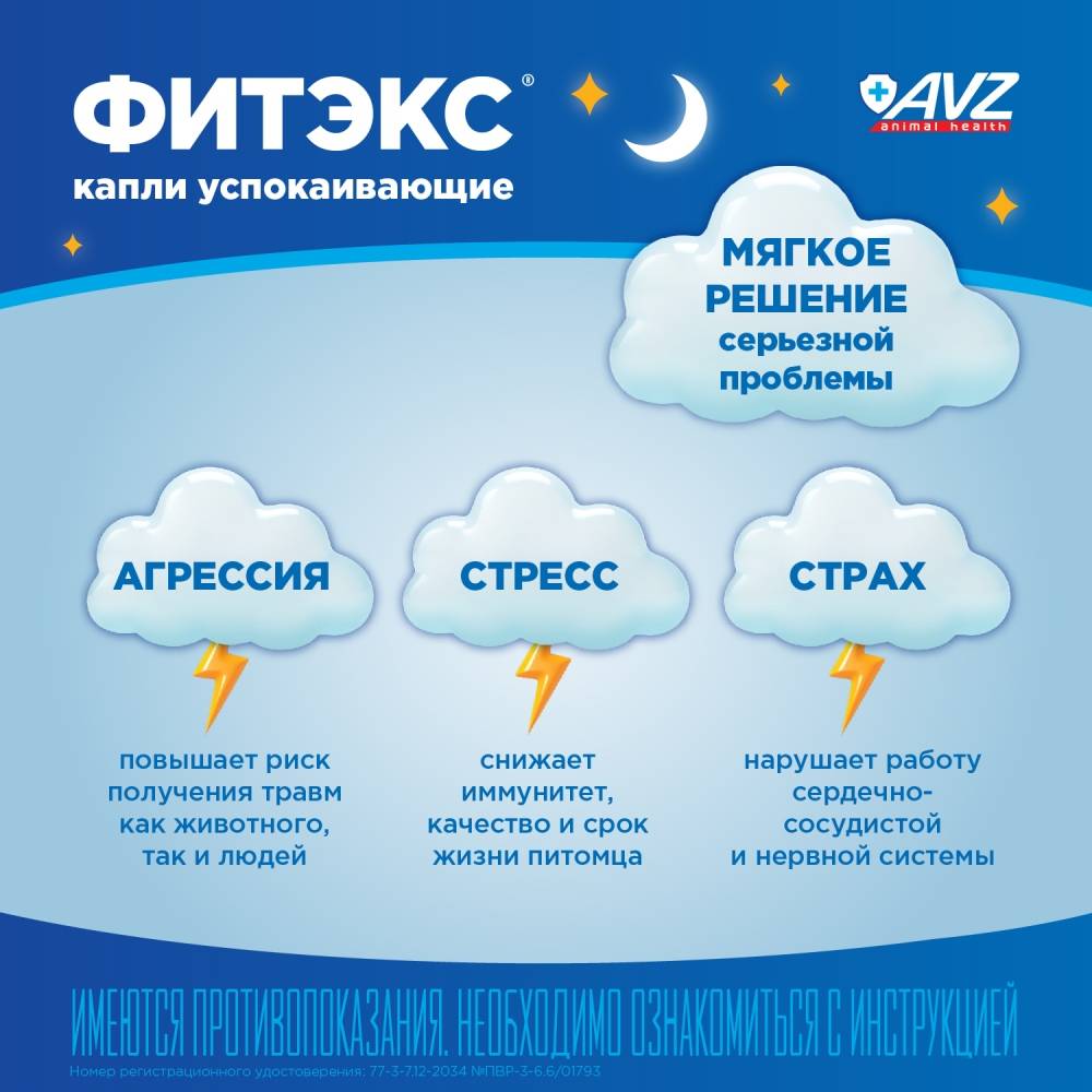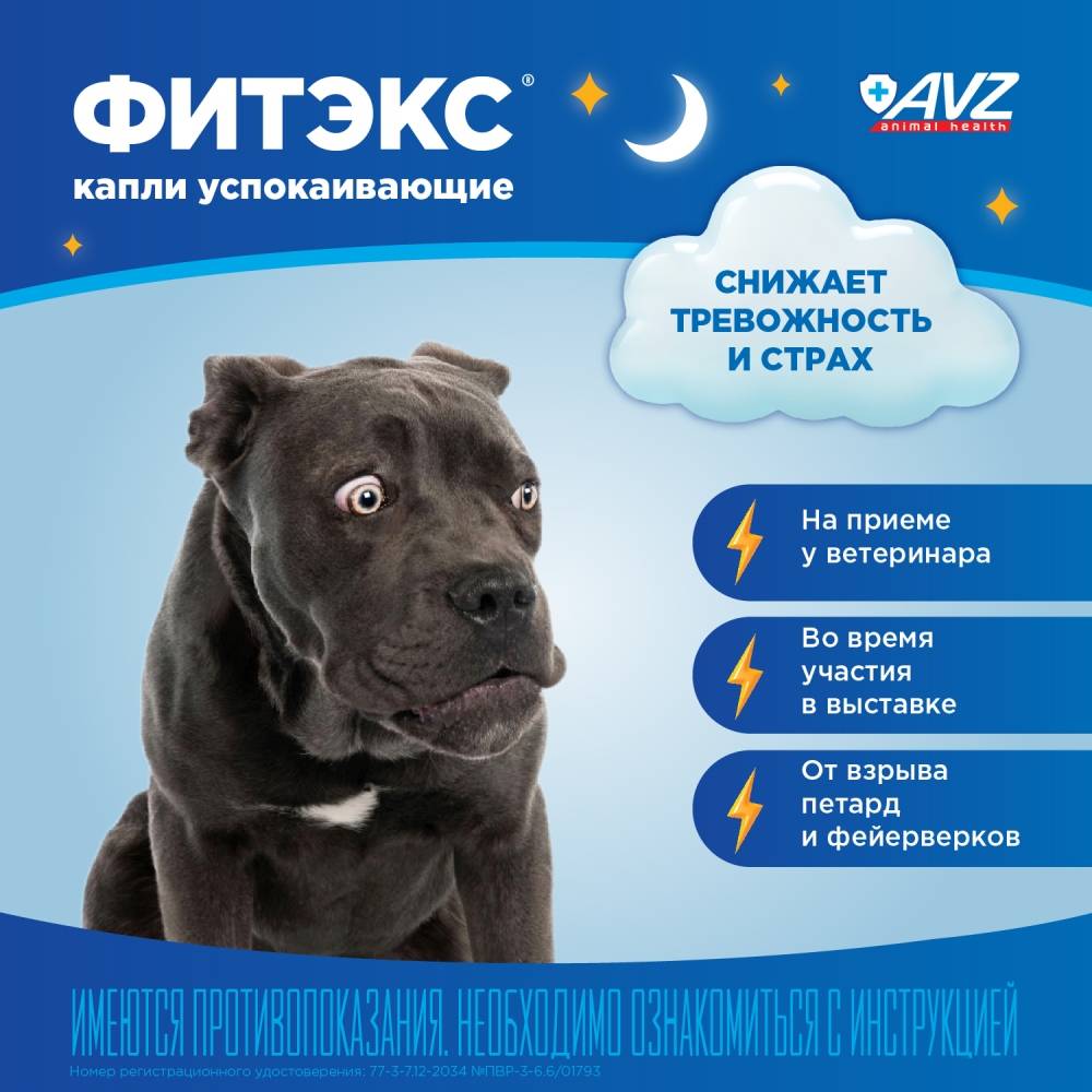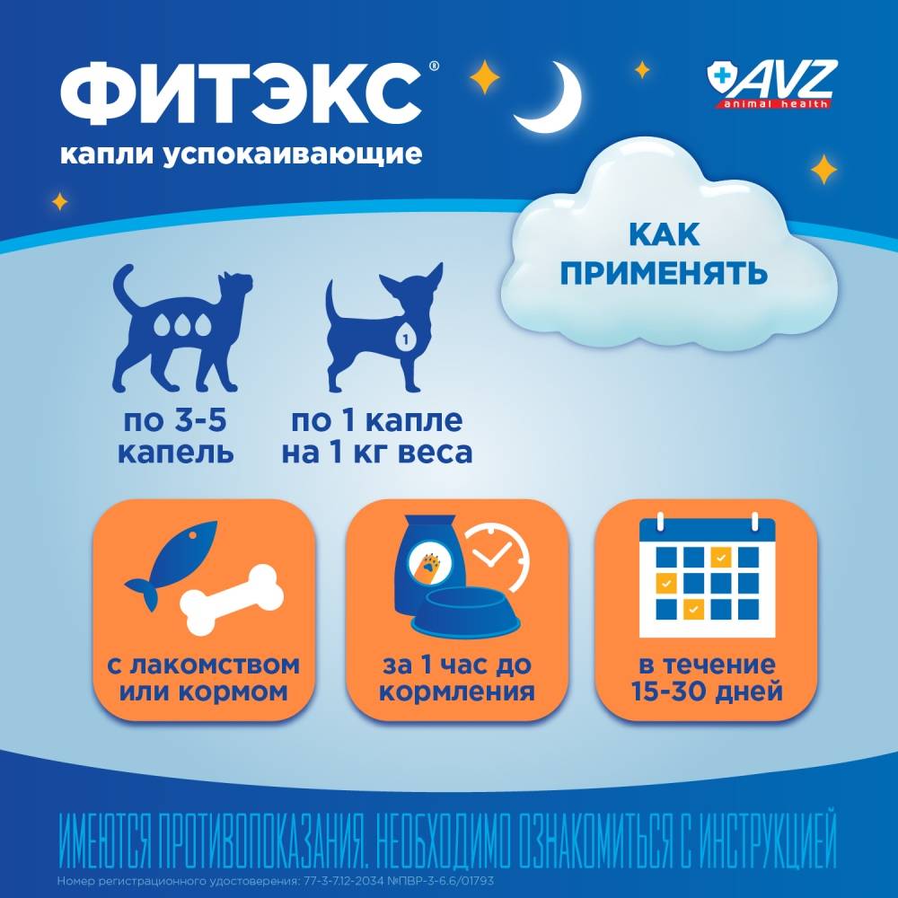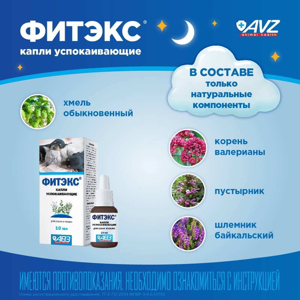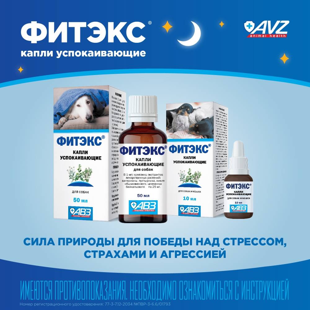Заблаговременный прием капель позволяет предотвратить у сильно возбудимых животных развитие стрессовых явлений при транспортировке, смене обстановки, участии в выставках, соревнованиях, посещении ветеринарной клиники, для подавления синдрома разлуки с хозяином. Обладая умеренным седативным действием без снотворного эффекта, ФИТЭКС® капли успокаивающие облегчают дрессировку излишне возбудимых животных.