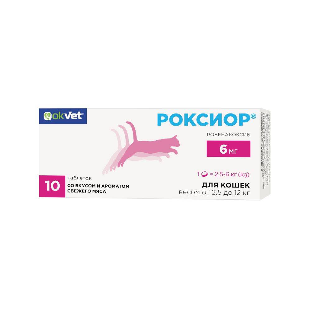 РОКСИОР® применяют кошкам в качестве противовоспалительного и болеутоляющего препарата при воспалительных и болевых синдромах различного происхождения, включая острые и хронические заболевания опорно-двигательного аппарата (артриты, артрозы, синовиты, вывихи), воспалительные заболевания мягких тканей, а также в качестве анальгезирующего и противовоспалительного препарата в послеоперационный период.