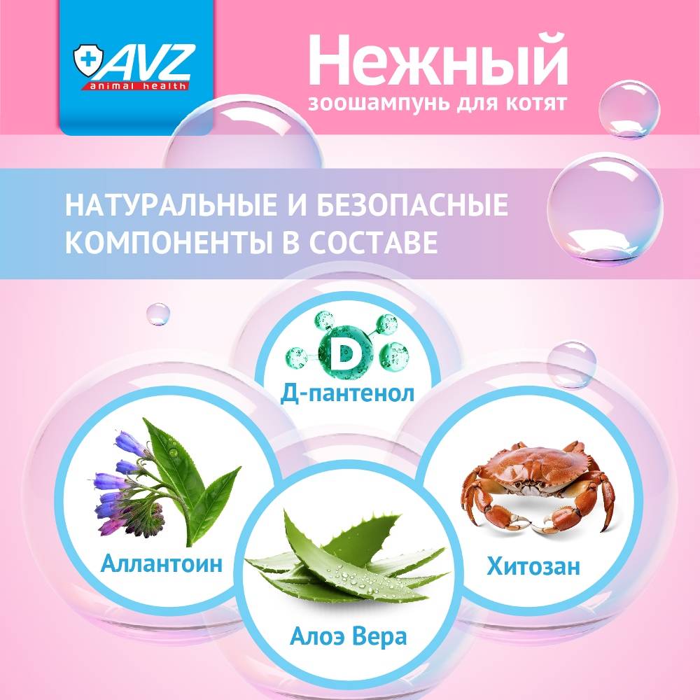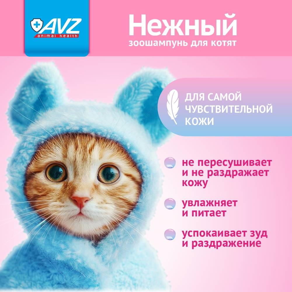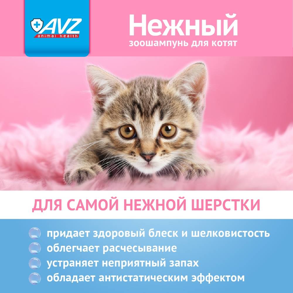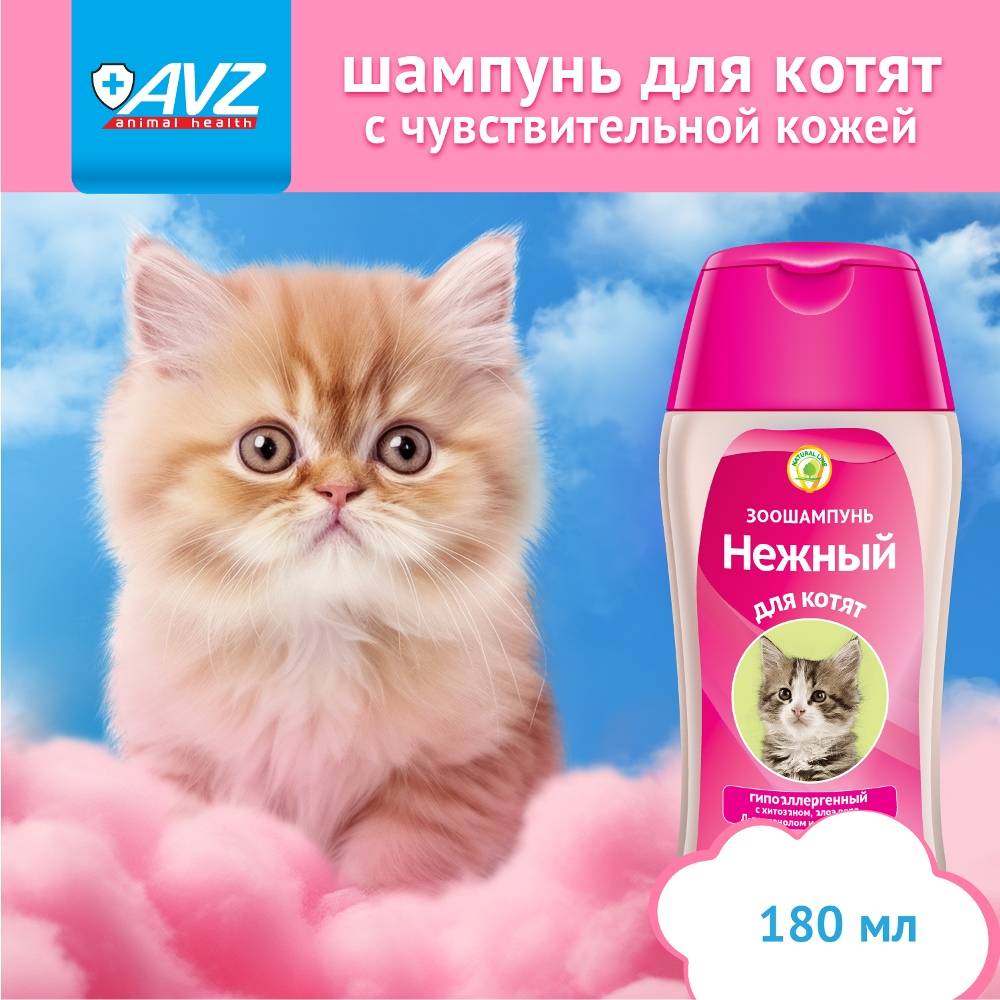 Зоошампунь «Нежный» применяют для регулярного ухода за кожно-волосяным покровом котят с чувствительной кожей всех возрастов и пород.