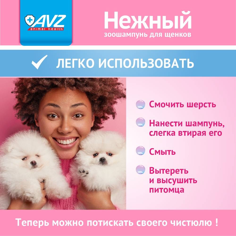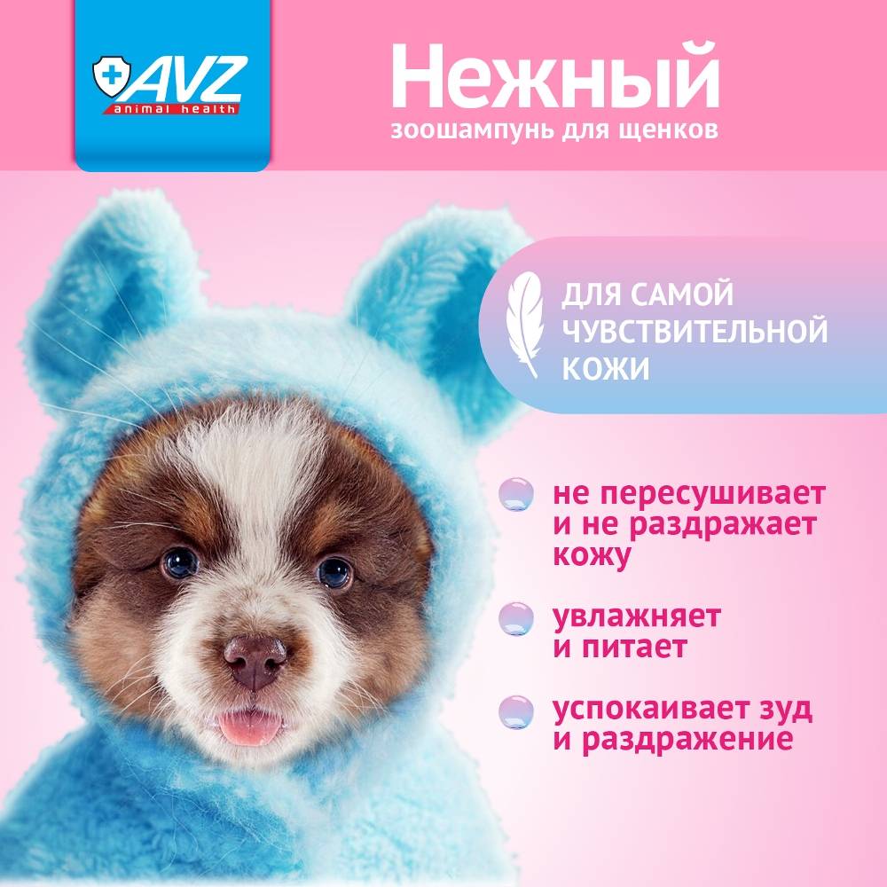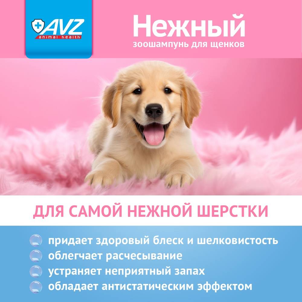 Зоошампунь «Нежный» применяют для регулярного ухода за кожно-волосяным покровом щенков с чувствительной кожей всех возрастов и пород.