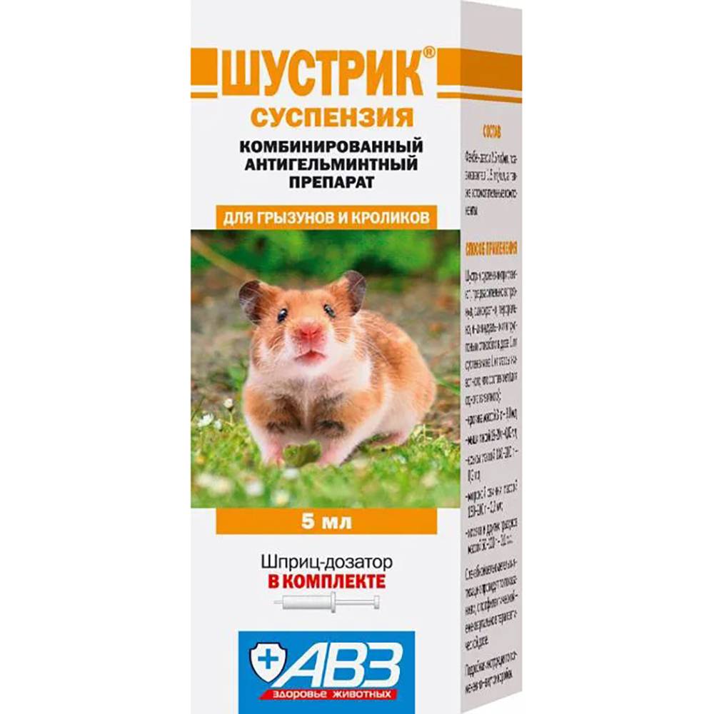 АВЗ Шустрик суспензия антигельминтная для грызунов используется в профилактических и лечебных целях. Содержит компоненты, не вызывающие негативного влияния на здоровье любимца. Эффективно противостоит паразитам, быстро уничтожая их в организме. Не разрушает иммунную систему. Перед применением следует ознакомиться с инструкцией, во избежание побочных явлений.