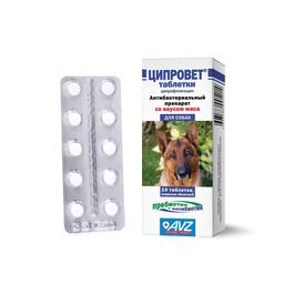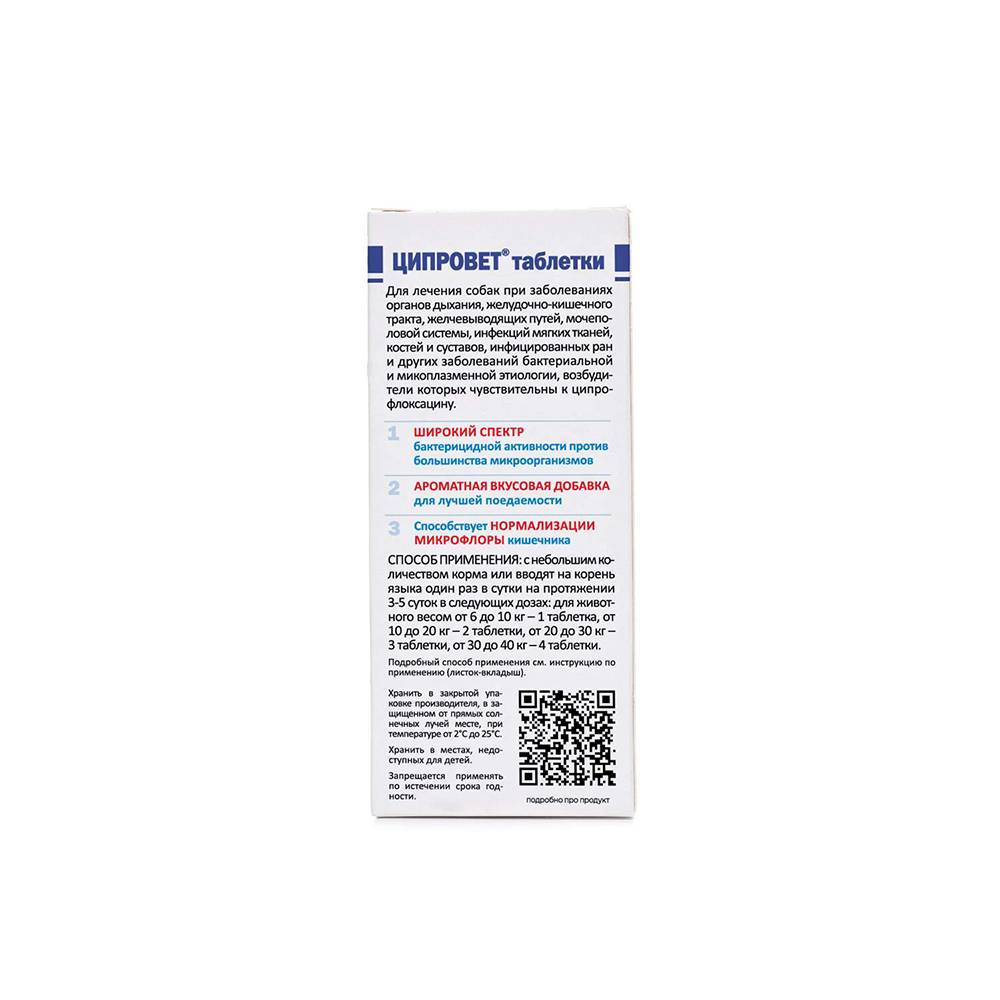 «Ципровет таблетки для кошек и собак мелких пород»; - собакам средних и крупных пород – 1 таблетка на 10 кг массы животного «Ципровет таблетки для собак».