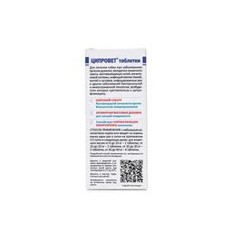 Ципровет для собак 50 мг 10 таб. назначают собакам с лечебной целью при хронических и острых бактериальных инфекциях желудочно-кишечного тракта, желчных путей, органов дыхания, мочеполовой системы, кожи и мягких тканей, костей и суставов, а также при вторичных инфекциях на фоне вирусных заболеваний, возбудители которых чувствительны к ципрофлоксацину.
