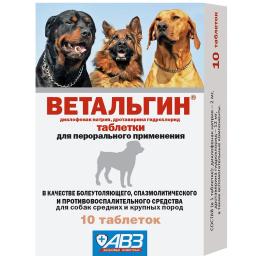 Ветальгин - болеутоляющее, спазмолитическое и противовоспалительное средство для средних и крупных пород собак.