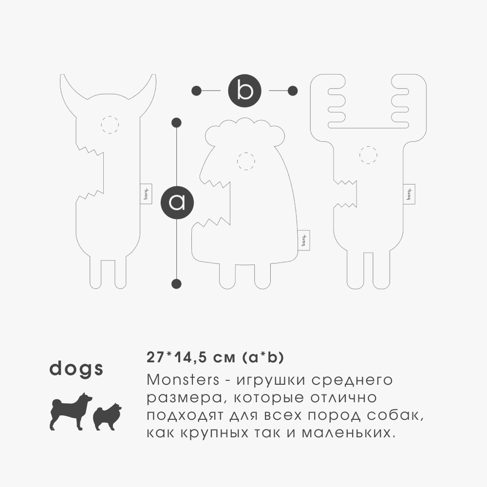 Дизайн игрушек разработан специально для животных и их хозяев: плоская форма удобна для маленьких питомцев, при этом игрушки удобно держать в руке для совместных игр. Monsters - игрушки среднего размера, которые отлично подходят для всех пород собак, как крупных так и маленьких.