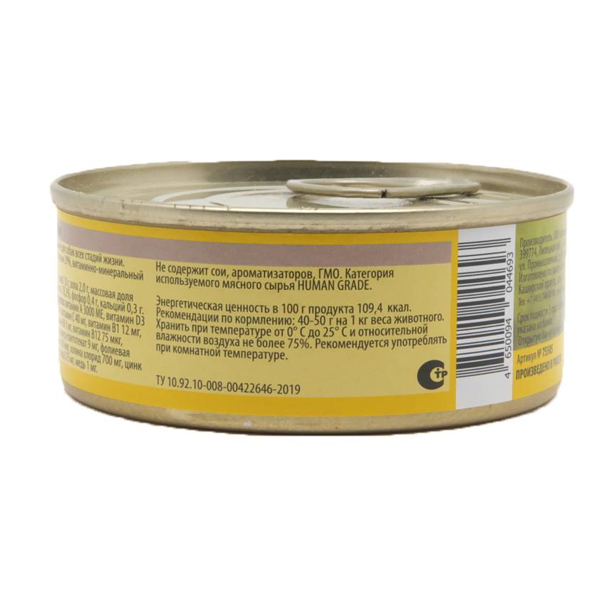 кролик 70%, бульон 29%, витаминно-минеральный комплекс 1%. Не содержит сои, ароматизаторов, ГМО. Категория используемого мясного сырья HUMAN GRADE.