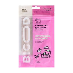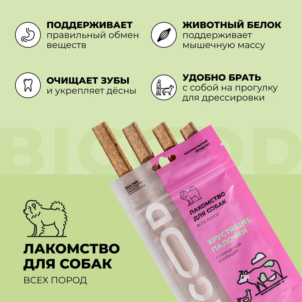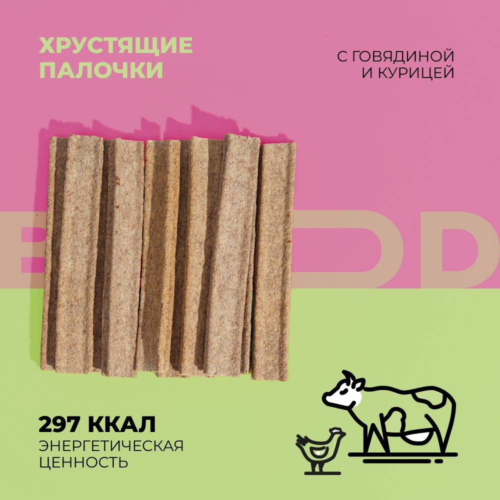 BIGOOD Хрустящие палочки с говядиной и курицей - натуральное лакомство для собак всех пород. Нормализует обмен веществ. Отличный источник белка, незаменимых аминокислот, витаминов и микроэлементов. Хрустящие палочки отлично подойдут для чистки зубов от налета, поддержания гигиены полости рта и укрепления дёсен.