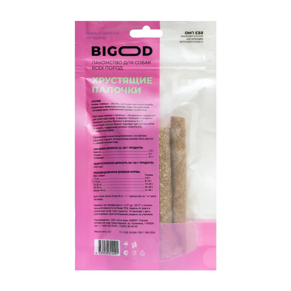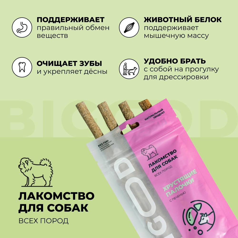 BIGOOD Хрустящие палочки с печенью - натуральное лакомство для собак всех пород. Содержит большое количество фолиевой кислоты, биотина и витамины А и D. Хрустящие палочки отлично подойдут для чистки зубов от налета, поддержания гигиены полости рта и укрепления дёсен. Это лакомство станет не только приятным угощением для вашего питомца, но и полезным дополнением к ежедневному уходу за его здоровьем.