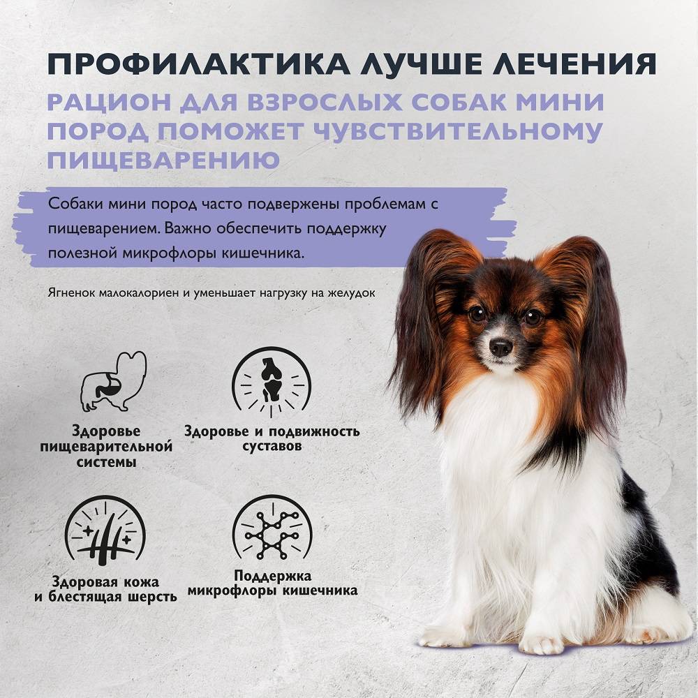 - Разработан специально для взрослых собак мини-пород с чувствительным пищеварением.