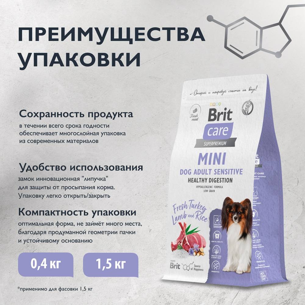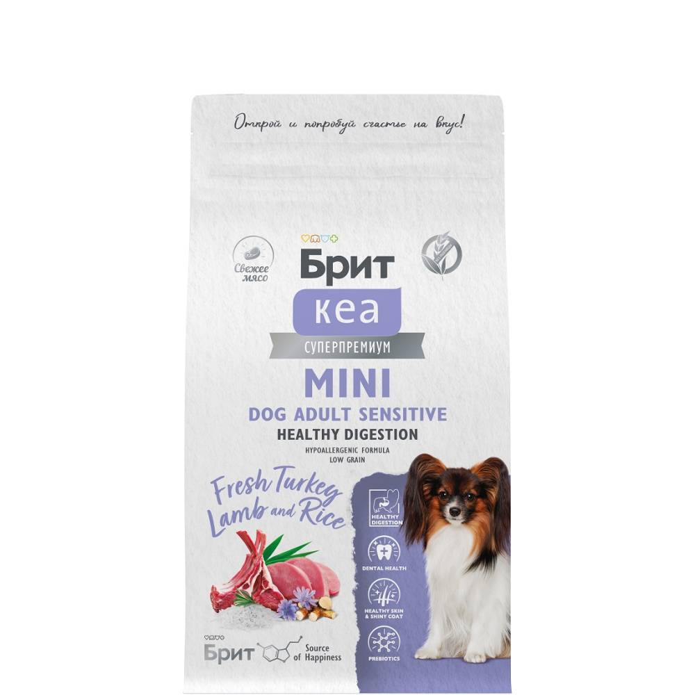 Brit Care Superpremium Mini Dog Adult Sensitive. Healthy Digestion. Fresh Turkey, Lamb & Rice. Полнорационный сухой корм суперпремиум-класса со свежей индейкой, ягненком и рисом для взрослых собак мини-пород (до 10 кг). Чувствительное пищеварение.