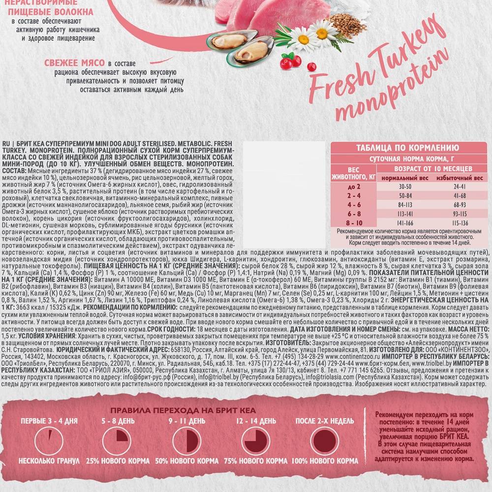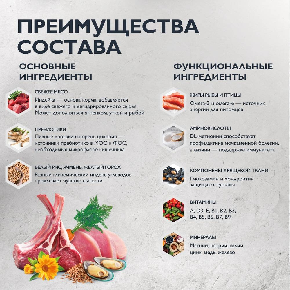 мясные ингредиенты 37 % (дегидрированное мясо индейки 27 %, свежее мясо индейки 10 %), цельнозерновой ячмень, рис цельнозерновой, желтый горох, животный жир 7 % (источник Омега-6 жирных кислот), овес, гидролизованный животный белок 3,5 %, растительный протеин (в том числе картофельный и гороховый), клетчатка свекловичная, витаминно-минеральный комплекс, пивные дрожжи (источник маннанолигосахаридов), льняное семя, рыбий жир (источник Омега-3 жирных кислот), сушеное яблоко (источник растворимых пребиотических волокон), корень цикория (источник фруктоолигосахаридов), холинхлорид, DL-метионин, сушеная морковь, сублимированные ягоды брусники (источник органических кислот, профилактирующих МКБ), экстракт цветков ромашки аптечной (источник органических кислот, обладающих противовоспалительным, противомикробным и спазмолитическим действием), экстракт одуванчика лекарственного: корни, листья и соцветия (источник витаминов и минералов для поддержки иммунитета и профилактики заболеваний мочевыводящих путей), новозеландская мидия (источник хондропротекторов), юкка Шидигера, L-карнитин, хондроитин, глюкозамин, антиоксиданты (витамин Е, экстракт розмарина, натуральные токоферолы).