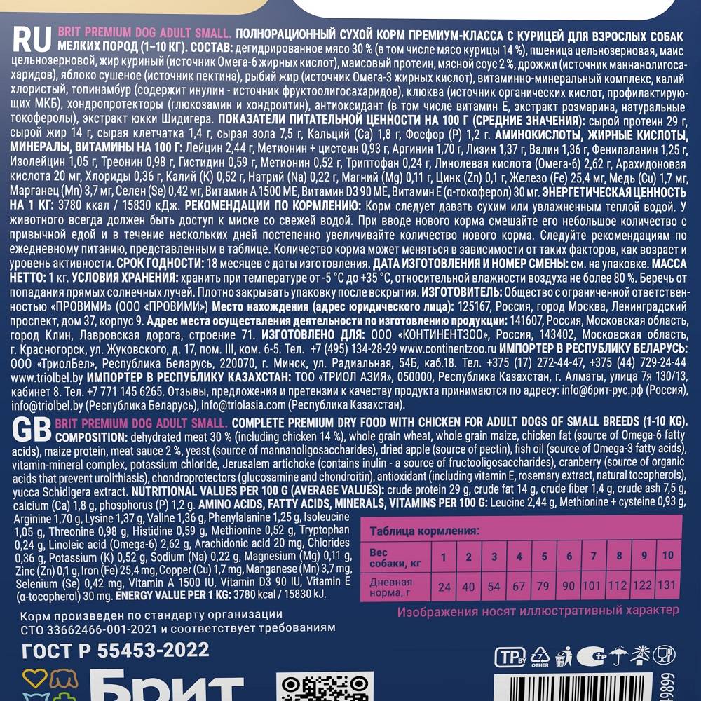 - Брит Премиум — корм премиум класса с высоким содержанием мяса 30%, в том числе мясо курицы 14%.