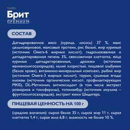 дегидрированное мясо (курица, лосось) 37 %, маис цельнозерновой, маисовый протеин, рис белый, жир куриный (источник Омега-6 жирных кислот), гидролизованная и дегидратированная печень 3%, свекловичная клетчатка, яйца куриные дегидратированные, дрожжи (источник маннанолигосахаридов), калий хлористый, пищевой альбумин (белок крови), витаминно-минеральный комплекс, рыбий жир (источник Омега-3 жирных кислот), таурин, сушеные ягоды клюквы (источник органических кислот, профилактирующих МКБ), DL-Метионин, антиоксидант (в том числе экстракт розмарина и токоферолы), топинамбур (источник инулина – фруктоолигосахаридов), экстракт юкки Шидигера.