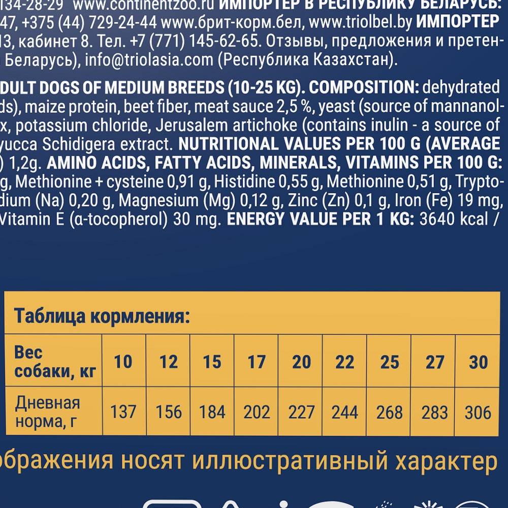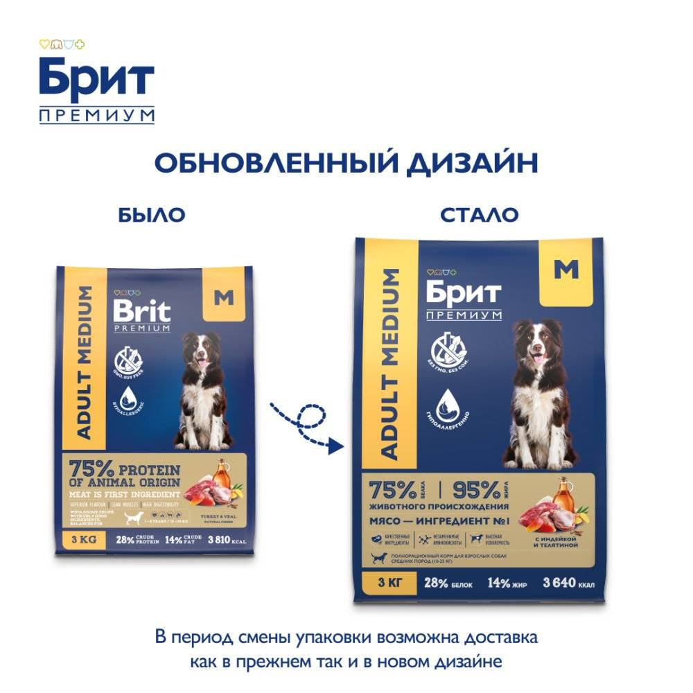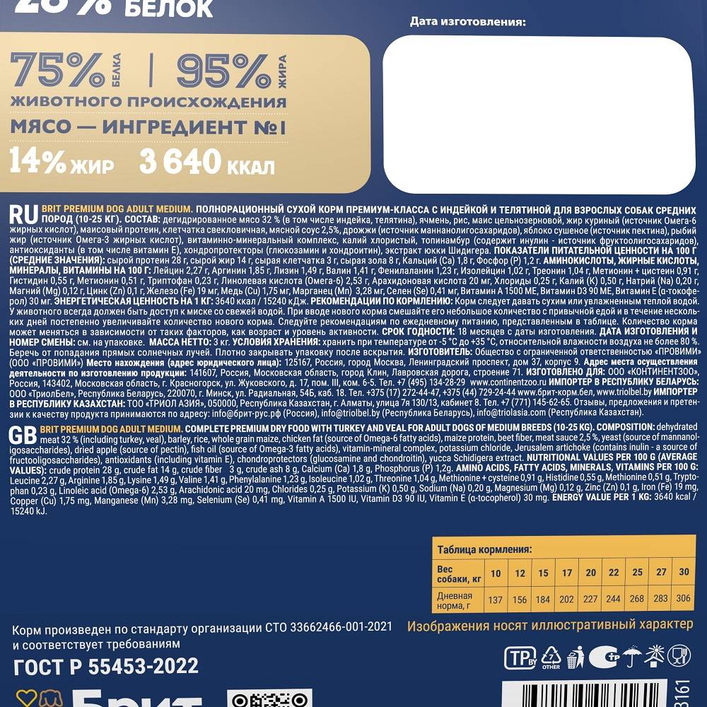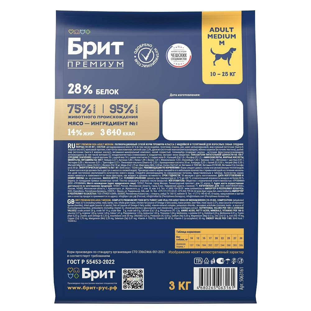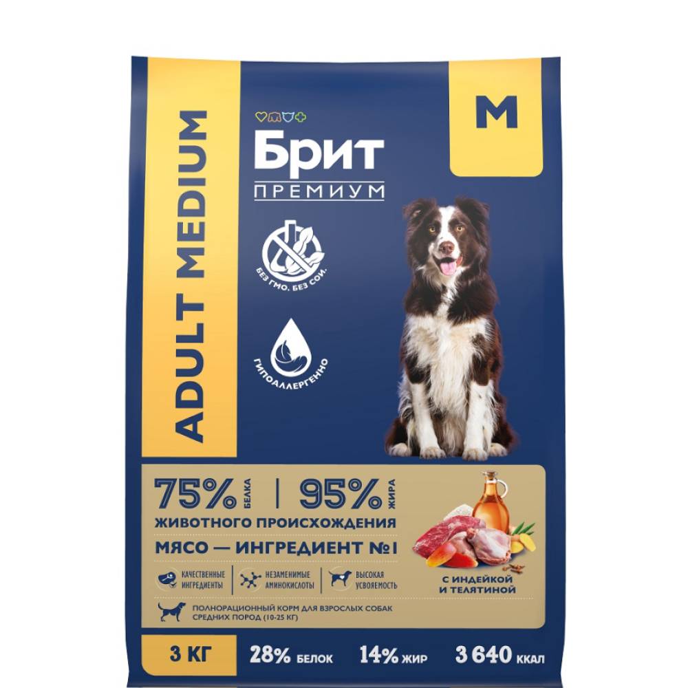 Полнорационный сухой корм премиум-класса с индейкой и телятиной для взрослых собак средних пород.
