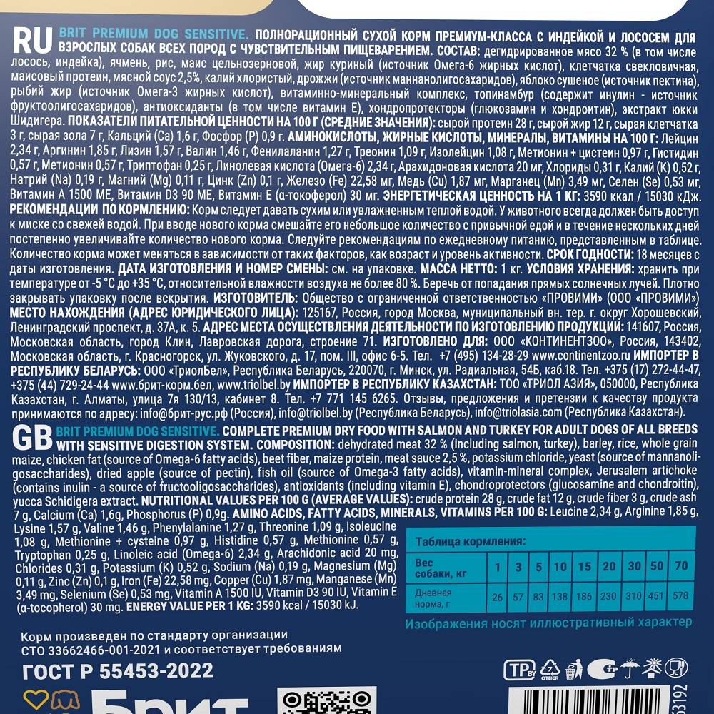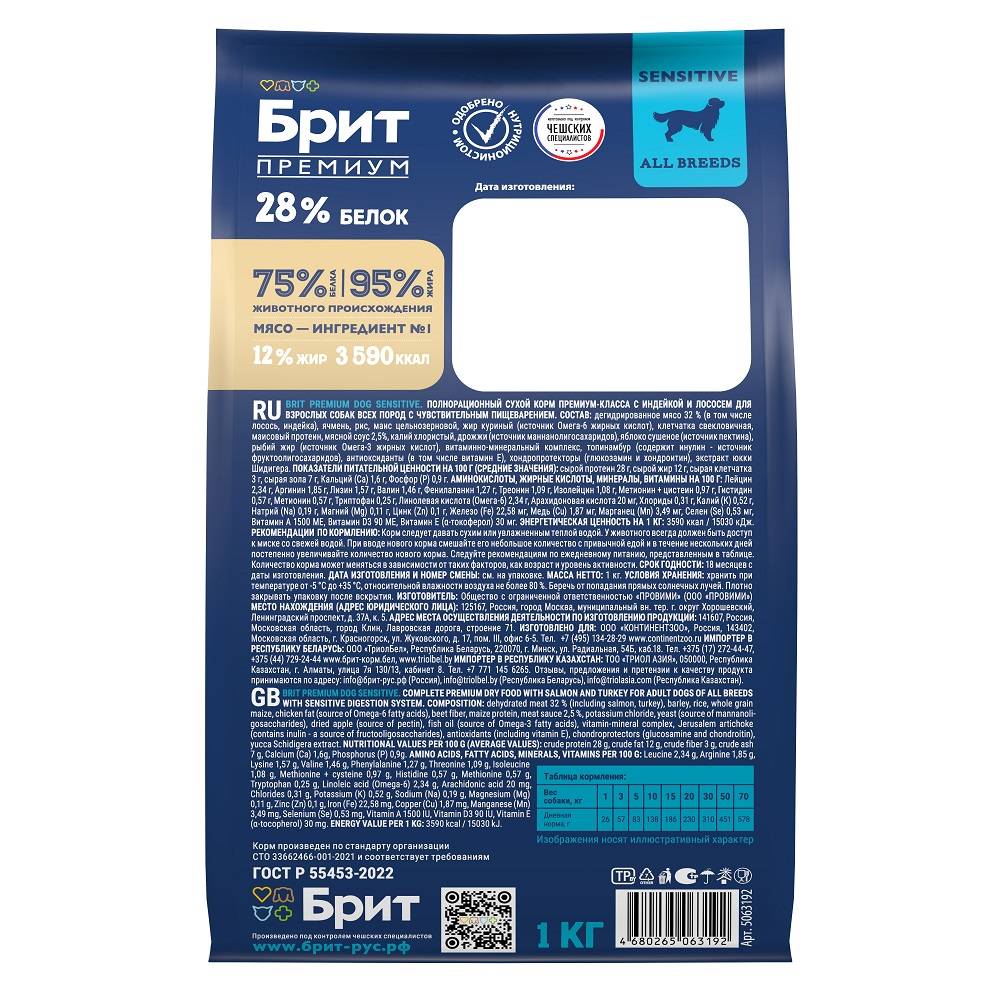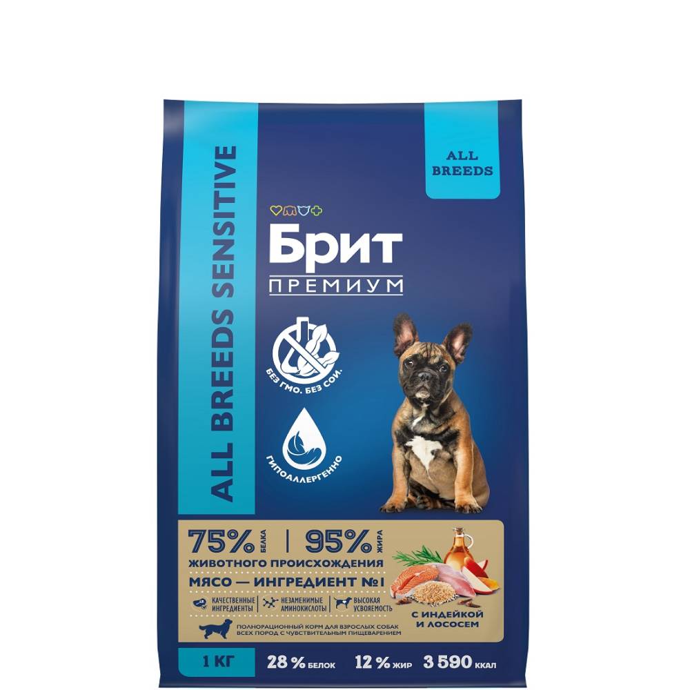 Полнорационный сухой корм премиум-класса с индейкой и лососем для взрослых собак всех пород с чувствительным пищеварением.