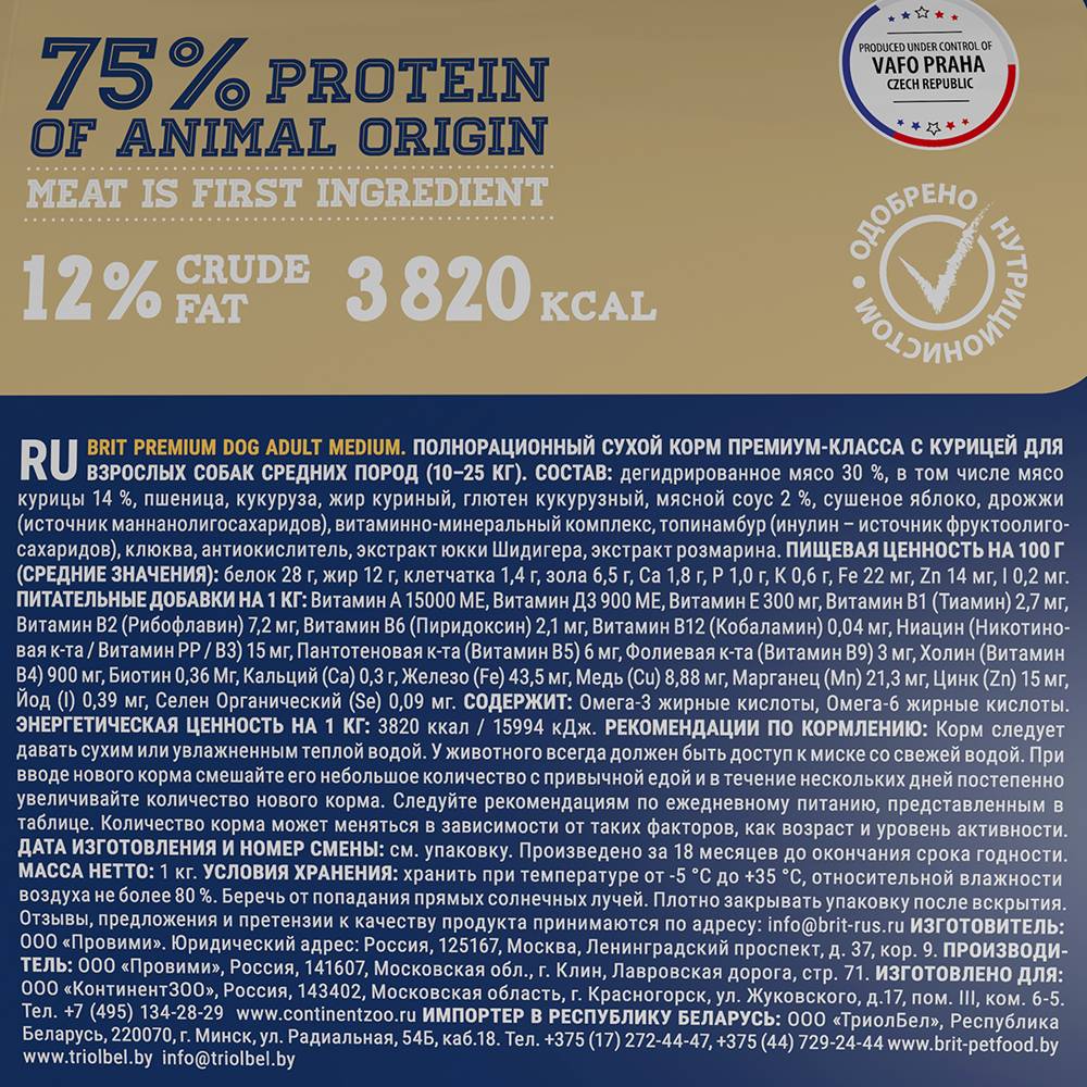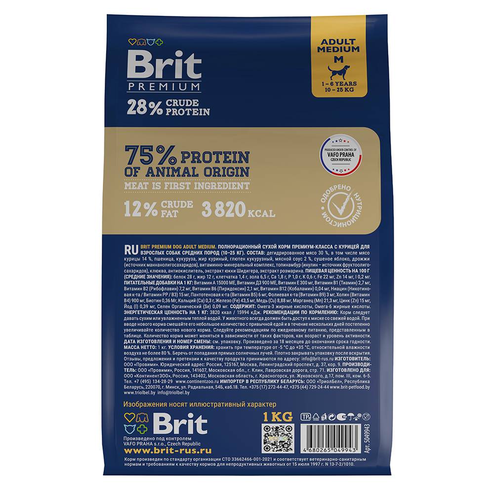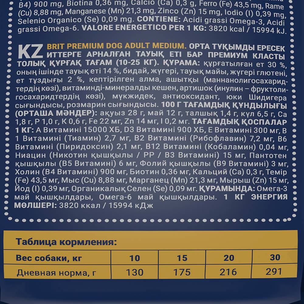 Полнорационный сухой корм премиум-класса с курицей для взрослых собак средних пород (10–25 кг). Brit Premium – корм премиум класса с высоким содержанием мяса 30%, в том числе мясо курицы 14%. Состав идеально сбалансирован и отвечает всем потребностям в зависимости от возраста и породы.