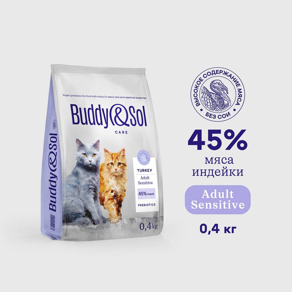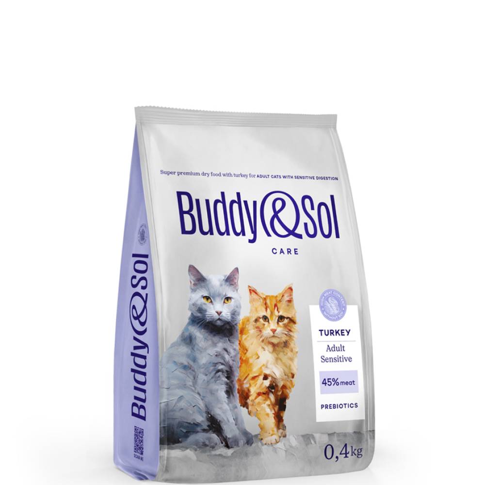 Сухой корм суперпремиум-класса Buddy&Sol Care ADULT SENSITIVE с индейкой специально разработан для взрослых кошек с чувствительным пищеварением или привередливых в еде.