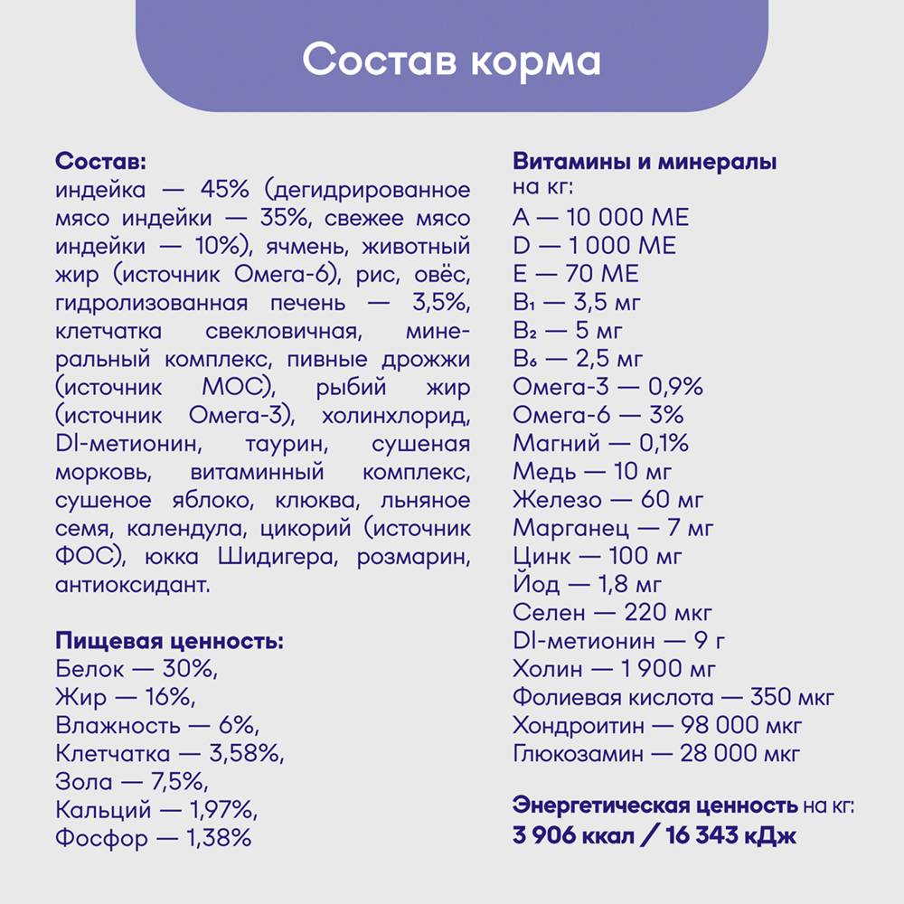 Диетическое и гипоаллергенное мясо индейки — единственный источник животного белка в составе. Индейка обладает прекрасной усвояемостью и высоким содержанием питательных веществ и содержит в большом количестве такие витамины, как, А и Е.